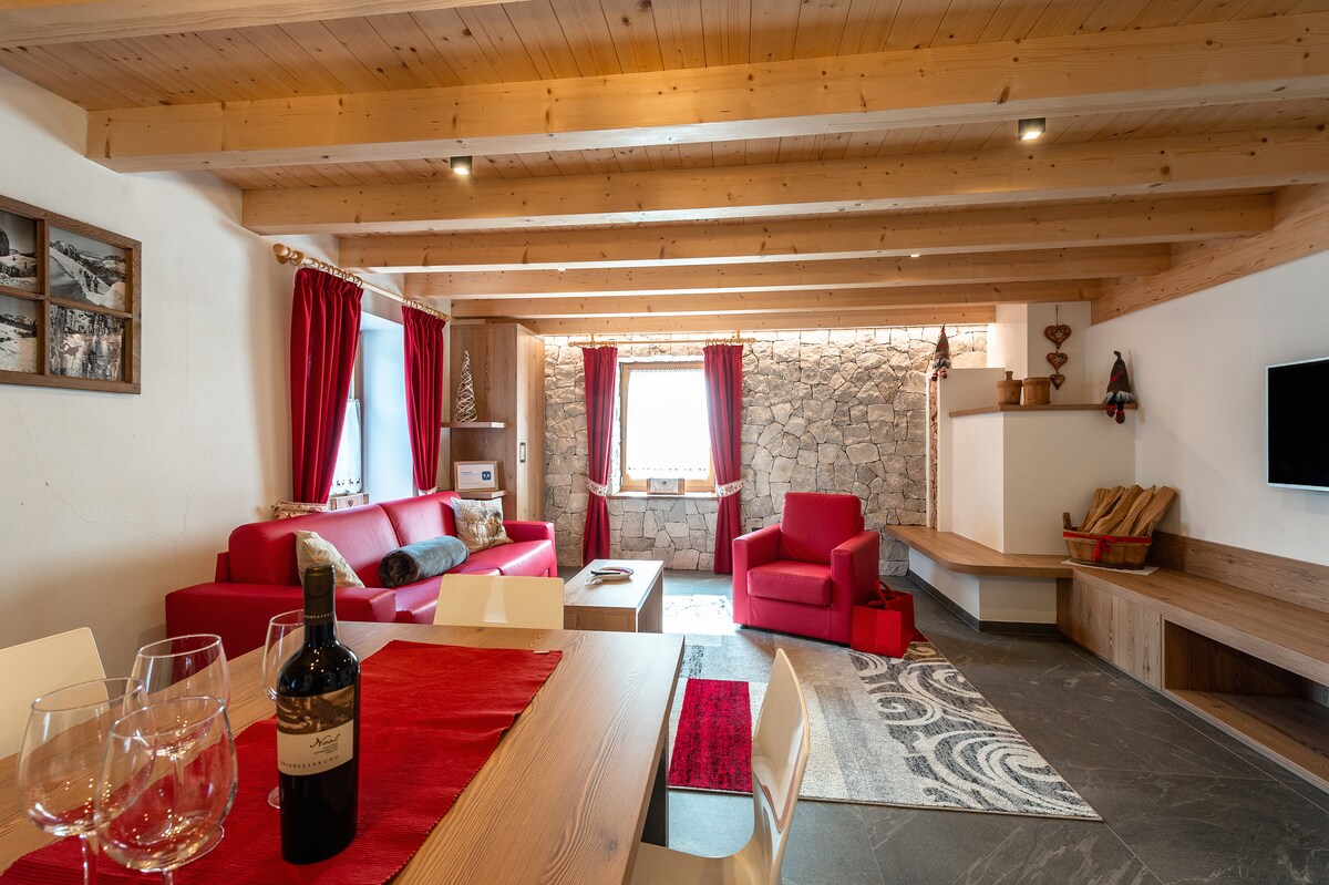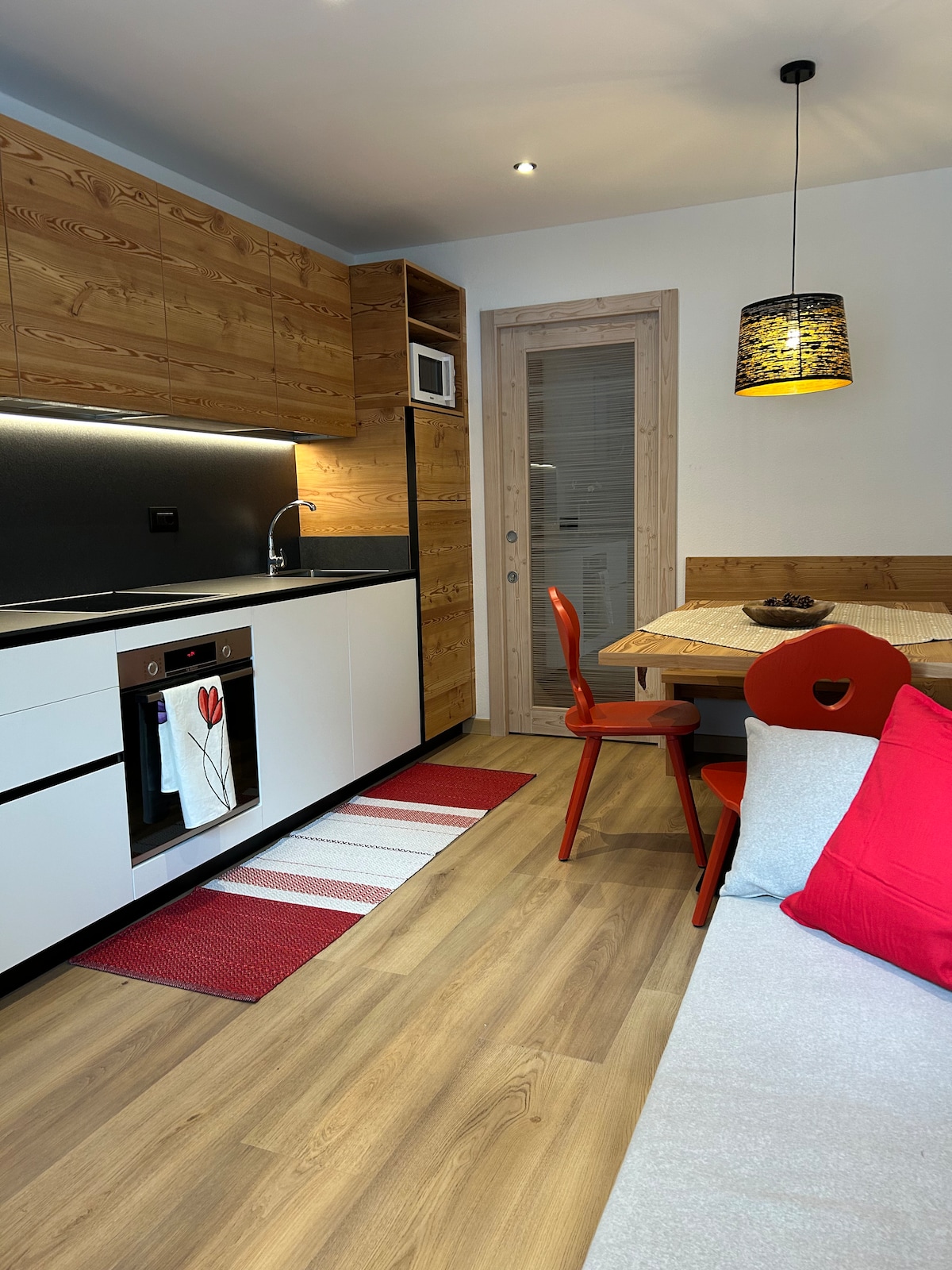 Una suite esclusiva ed elegante con panorama mozzafiato su Moena e sulle montagne. Arredata con legno naturale e finiture di pregio, dispone di ampio living con cucina attrezzata e terrazzo, grande tavolo da pranzo davanti all'enorme vetrata, area TV con due comode poltroncine reclinabili effetto cinema. Grande camera matrimoniale ad esposizione angolare e bagno con maxi doccia. Il centro di Moena è raggiungibile comodamente a piedi sulla strada panoramica in piano (7min.).