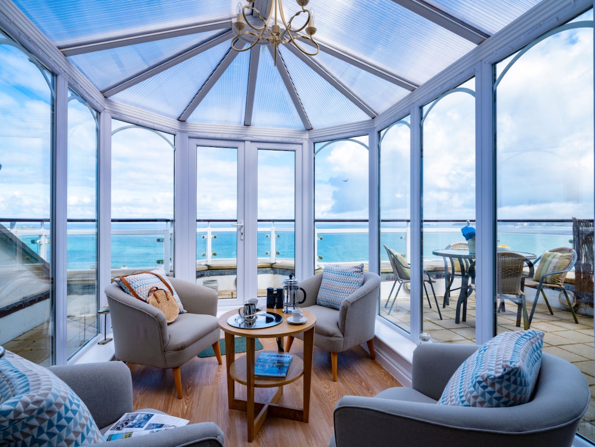Sandpiper is a stunning duplex penthouse apartment, perfectly situated to sit back and take in the spectacular panoramic views stretching from St Ives Bay to Godrevy Lighthouse. This idyllic apartment is just a few minutes walk to Carbis Bay beach and the South West Coastal path, making it ideal for walkers. There is a large balcony, perfect for socialising and soaking up the Cornish sun, and a beautiful sun room for relaxing in the cooler months.