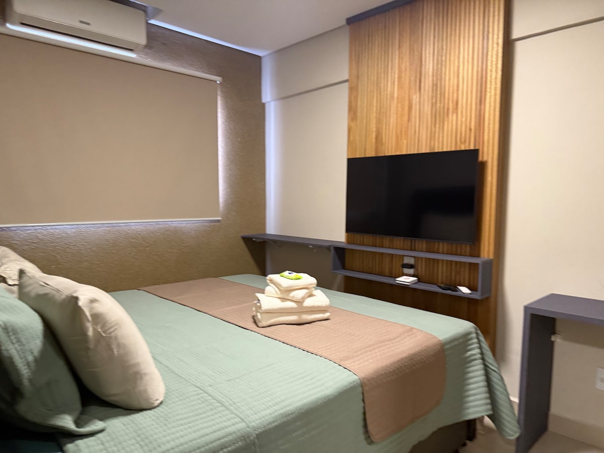 Studio mobiliado, Ar condicionado, tv 32, Painel , cama queen com cabeceira e criado mudo, sofá cama, cozinha com armário planejado, Frigobar, tem estacionamento, lindo, Sofisticado e bem-localizado. Esta acomodação elegante é perfeita para viagens. obs. o studio nao esta equipado para cozinhar.