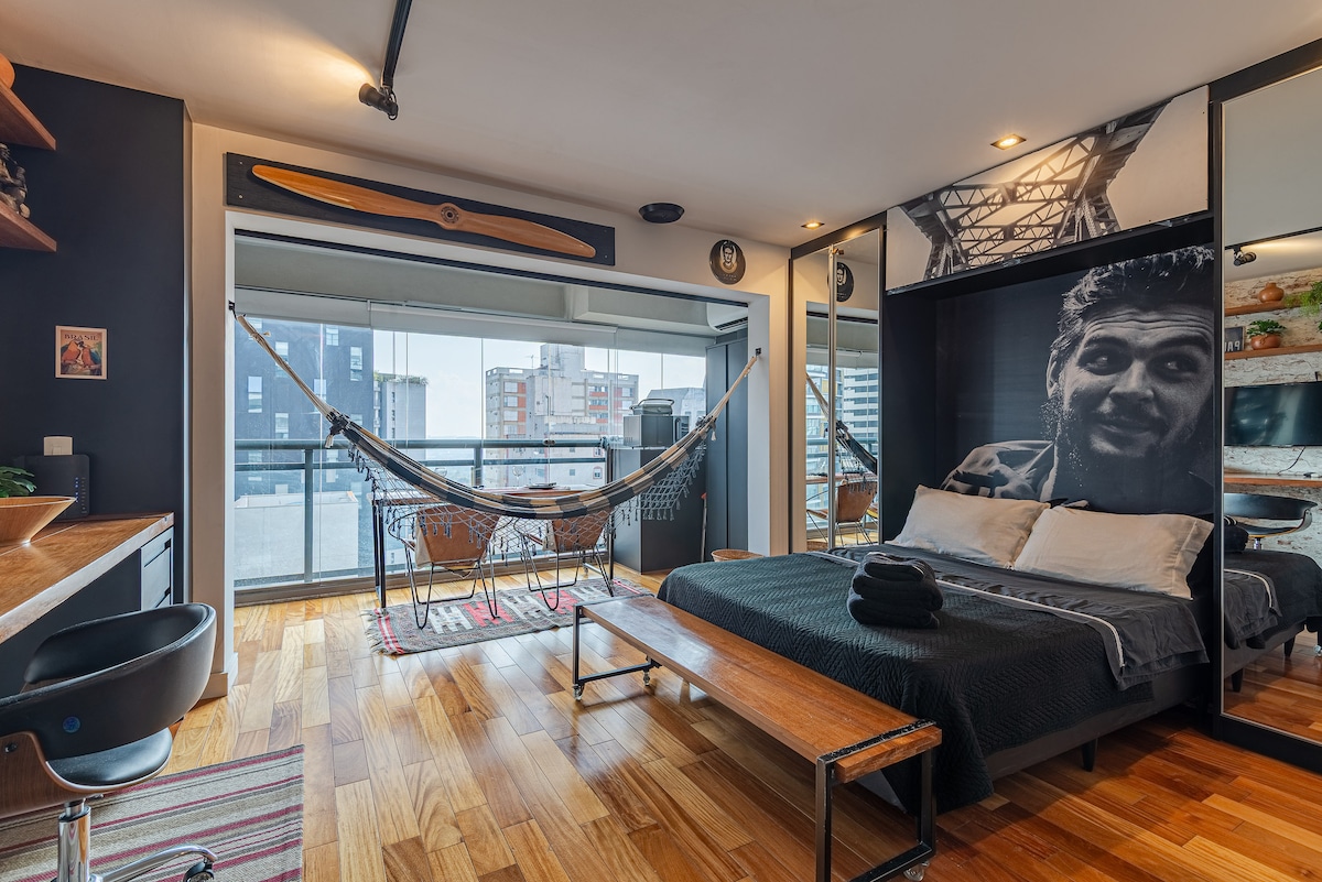 Estúdio espaçoso com muito design, arquitetura e a melhor vista de São Paulo. Loft completo! Com cama queen, closet, ar condicionado silencioso, cozinha completa, home office, WI-FI, TV 55” e uma belíssima banheira de imersão, de onde pode apreciar o seu drink preferido e curtir uma vista apaixonante. São Paulo toda estará há poucos minutos de você. Acesse o metrô andando apenas 200m. Reserve com tranquilidade! Proporcionaremos uma excelente hospedagem e uma ótima experiência!