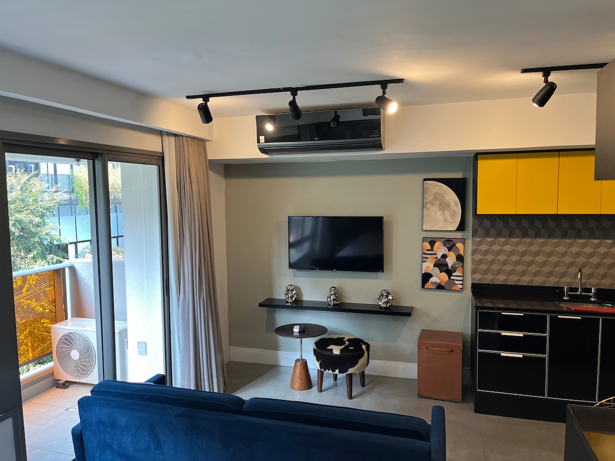 Boutique studio with one of the most beautiful views of São Paulo city. Placed 2 minutes walk from the subway. Fully equipped kitchen with refrigerator hidden by wooden door. Wi-fi, air-conditioning and smart TV 55 inches. Self check-in with smart electronic lock. Play tennis or go o gym and relax in the pools (outdoor or heated indoor) and saunas (wet or dry) afterwards. Common area also includes co-working spaces and laundry. Visitors need to be previously registered at the front dest.