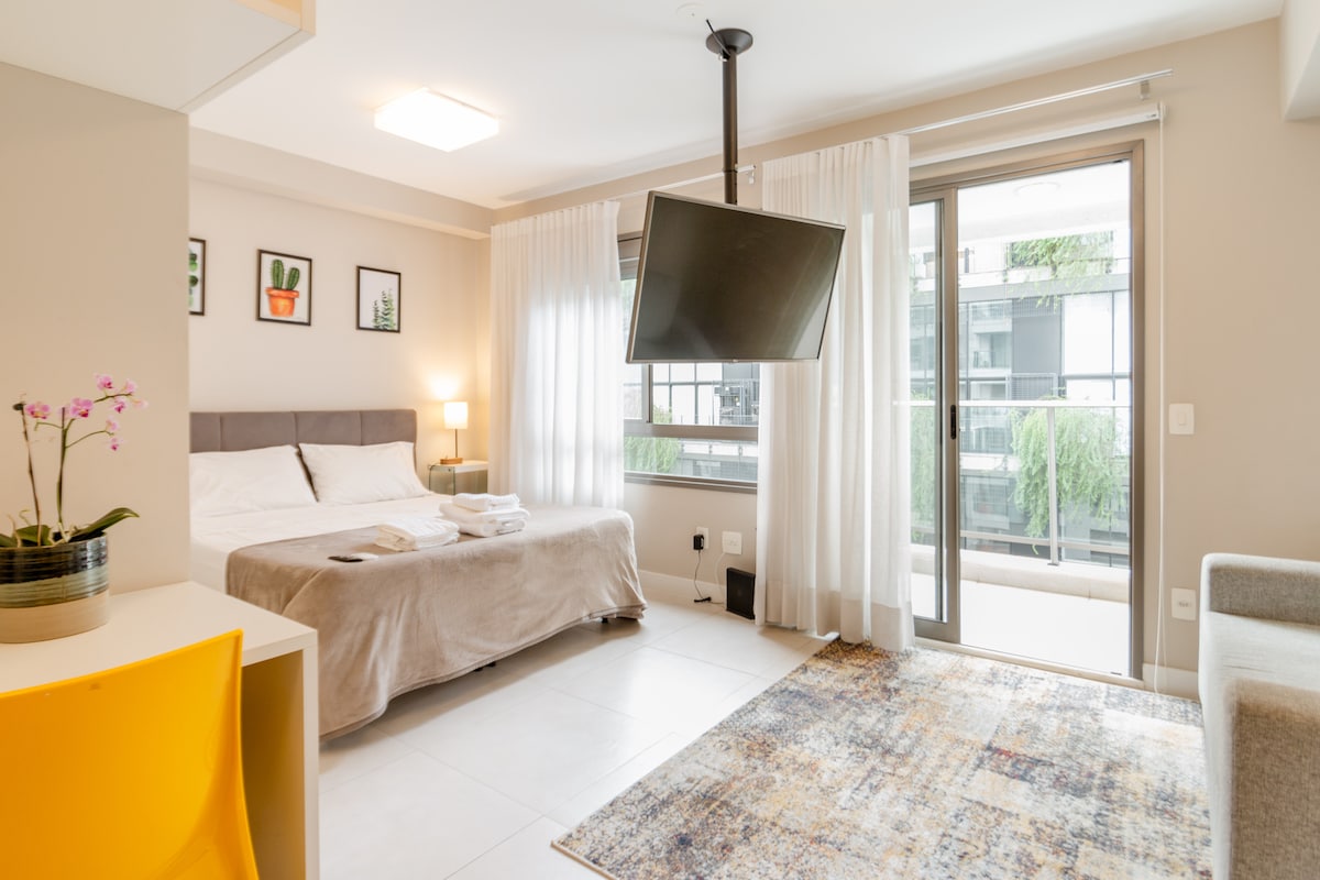 Enjoy the bohemian and artistic Vila Madalena, full of bars, restaurants and cafes. You can get to know the region or even take a tour to city parks with a bike, avaiable free of charge. Will you come to work? Focus on it at the confortable table facing the green balcony with a beautiful view of the tree tops. After all, enjoy the gym, poll, sauna and snooker room for your complete leisure.