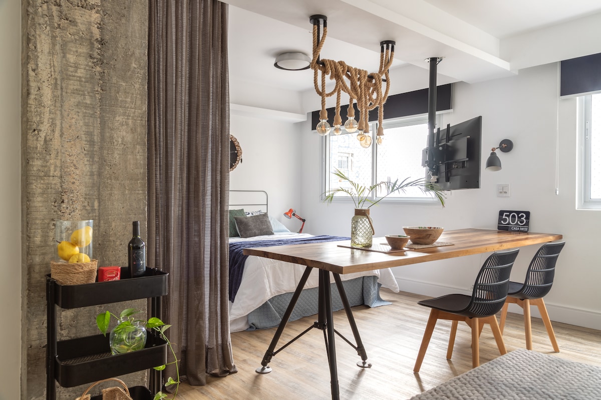 Looking for a cozy checkpoint in the heart of the city? You'll feel at home in this well-planned loft. Located in downtown Florianopolis, it's perfect for someone looking to explore the island or attend to an event nearby. Includes: - Queen bed - Complete gourmet kitchen - Washer and drier - Big table for meals and Home Office - 360 Rotational TV so you can watch from anywhere in the loft - Clean and modern bathroom - Wi-fi - Complete air conditioning