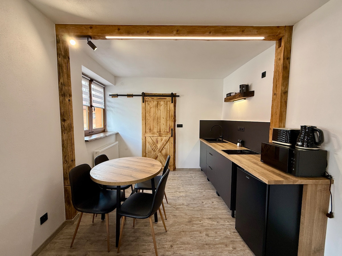 Beautifully decorated modern apartment in the heart of Kvilda - Šumava National Park just few steps from Ski Slope ( 100 meters ) and all major bike trails. Enjoy magnificent views of a nearby nature and national park. Apartment features free highspeed WIFI , fully equipped kitchen with dishwasher, stovetop, microwave and fridge , fully equipped bathroom. Sleeps up to 3 people + baby and offers separate bedroom above the living room ( reachable on stairs ) and foldable sofa in the living room.
