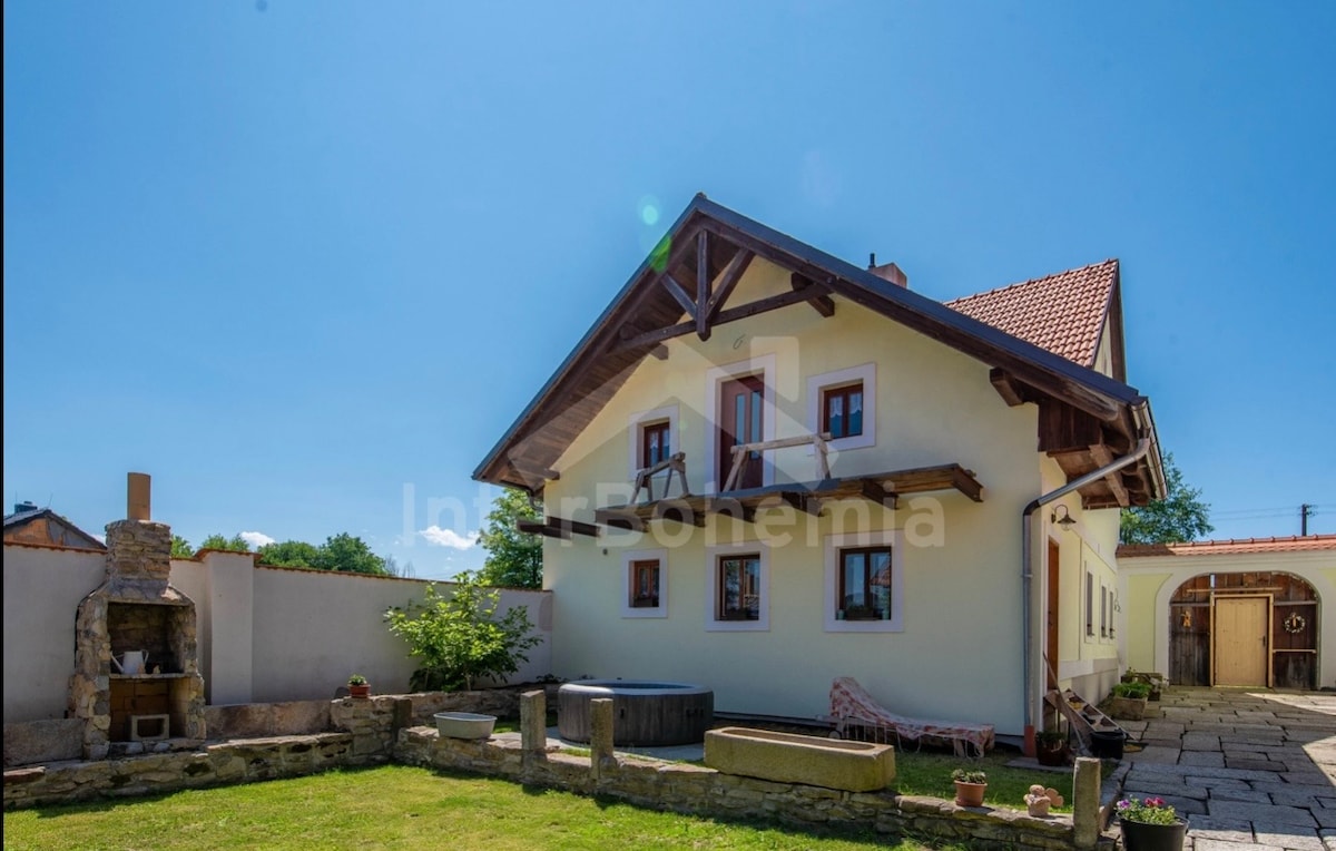 Kompletně zrenovovaný statek s uzavřeným dvorem, velkou zahradou, infrasaunou, bazénem, vířivkou . V přízemí kompletně vybavená kuchyně s elektrickým sporákem, mikrovlnnou troubou, lednicí, mrazákem, varnou konvicí a myčkou na nádobí. Obývací pokoj s jídelním stolem, křesly, TV a krbem. K dispozici infrasauna. Koupelna se sprchovým koutem, umyvadlem a odděleným WC. V podkroví celkem 3 ložnice. První s dvoulůžkem a jednolůžkem. Druhá se dvěma jednolůžky a TV a třetí s jednolůžkem, dvoulůžkem a TV