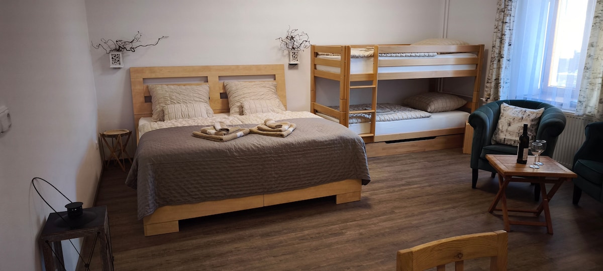 Apartmán je o velikosti 55 m2 a nachází se na náměstí v Husinci v památkové zóně. Apartmán má velkou ložnici s manželskou postelí a samostatným lůžkem, obývák s rohovým gaučem je spojen s vybavenou kuchyňskou linkou jídelním stolem, koupelna s vanou a samostatné WC, půjčení ložního prádla i ručníků v ceně. WI-FI i parkování zdarma. Historické jádro Husince je rodištěm Mistra Jana Husa a městskou památkovu zónou. V Husinci i v blízkém okolí se nachází celá řada pamětihodností.