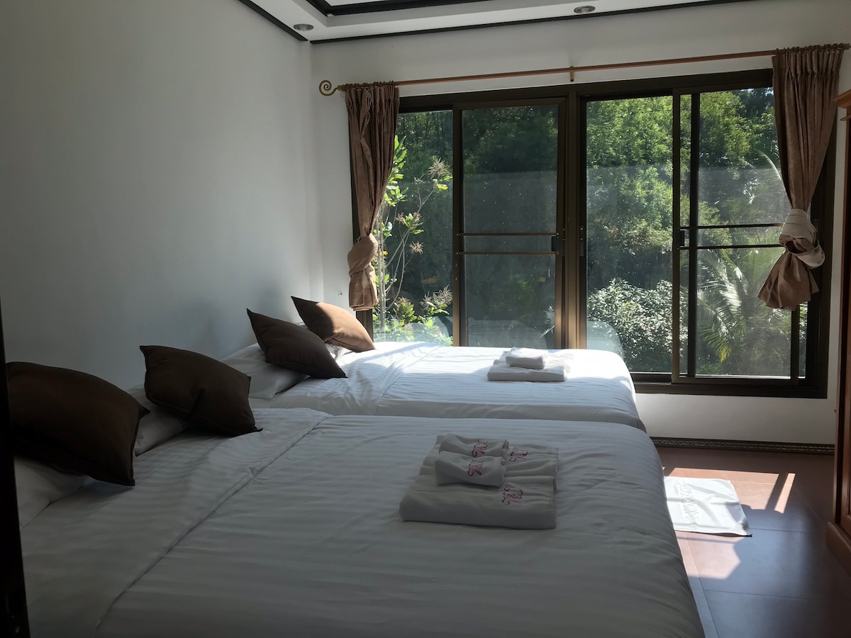บ้านพักตากอากาศที่ตั้งอยู่ในบรรยากาศธรรมชาติอันเงียบสงบ บนพื้นที่ 3 ไร่ เหมาะสำหรับการพักผ่อนแบบเต็มที่ รายล้อมด้วยเสียงใบไม้และสายลมเย็นๆ สระว่ายน้ำระบบจากุชชี่ส่วนตัว โต๊ะพูล เตาย่างบาร์บีคิว คาราโอเกะ ห้องจัดเลี้ยงรองรับ 20-30 คน และมีเครื่องเล่นสำหรับเด็กๆ ขับรถจากกรุงเทพฯ แค่เพียง 1 ชั่วโมงเศษ