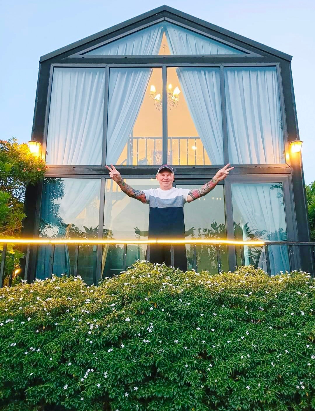 The home styled pool villa, surrounded by natural Scenes. The villa has a modern design with a balcony and greenery outdoor seating area that connects to the swimming pool, offers a refreshing, relaxing, ideal for leisure, BBQ and family activities. The living area is spacious with a large sofa, pillows, clean and vibrant atmosphere. The bedrooms offer comfort with large beds, and natural light, providing a warm and relaxing environment. The shower room is well clean, filled with good amenity.
