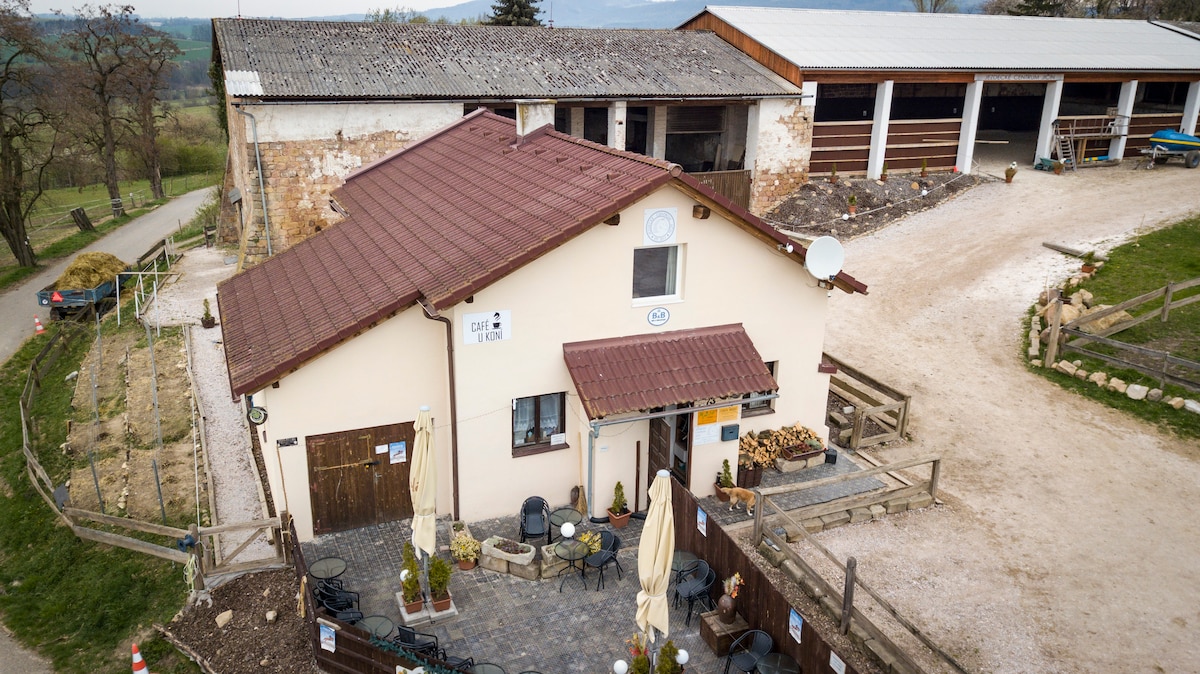 Ubytování s nejkrásnějším výhledem na Jičín a okolí, se nachází v zemědělské usedlosti se stájí, jejíž základy pochází ze 17. století. Renovované prostorné podkrovní apartmá nabízí hostům veškeré pohodlí a komfort, skylink TV, kvalitní wi-fi, monitorované parkování, grill. Hosté zažijí jedinečnou atmosféru života na statku s chovem koní. Výjimečná lokalita umožňuje našim hostům být obklopeni přírodou luk a pastvin, a zároveň se nacházet v docházkové vzdálenosti historického centra města Jičín