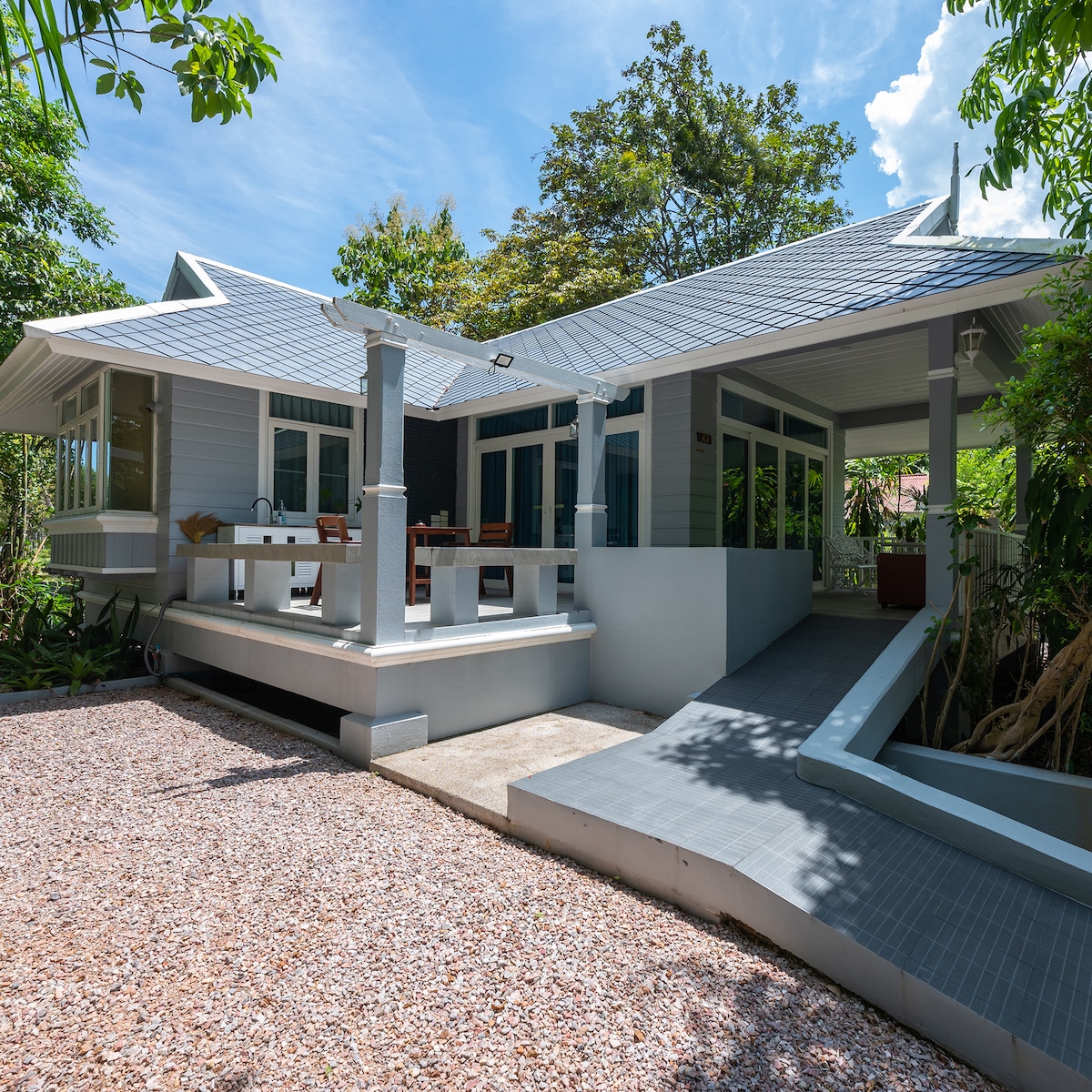 华欣 modern villa 封闭安全低密度小区独栋别墅 私家独立泳池 公共健身房。房主也在此小区常年居住,入住后有任何问题帮助可以随时与房主当面沟通。小区与皇家领地皇室公主庄园一墙之隔,是在华欣少有的几个与皇室使用同一水源的小区,小区地理位置在华欣地势较好,通风干燥,不会出现海边居住一样的潮湿发霉,即使是雨季台风也排水顺畅,全年不会有路面或小区淹水的烦恼,即使发生了太平洋海啸也不必担心,可保护你和度假的家人在台风、地震、海啸等自然突发状况的安全。想远离都市的喧嚣,回归纯净自然的好去处。小区附近有黑山高尔夫球场和黑山水上乐园(7分钟车程),到华欣火车站和海边沙滩浴场(10分钟车程)。附近自然风光极好空气清新,交通可自驾、租车出行或可电话预约订车,附近有多家饭店也可以不出门吃到正宗泰国大餐(Grab或Panda),附近有7.11、BIG-C大型超市、市场、酒吧、Thai massage等生活便利,与海边网红地点附近相比长期居住成本更合理。