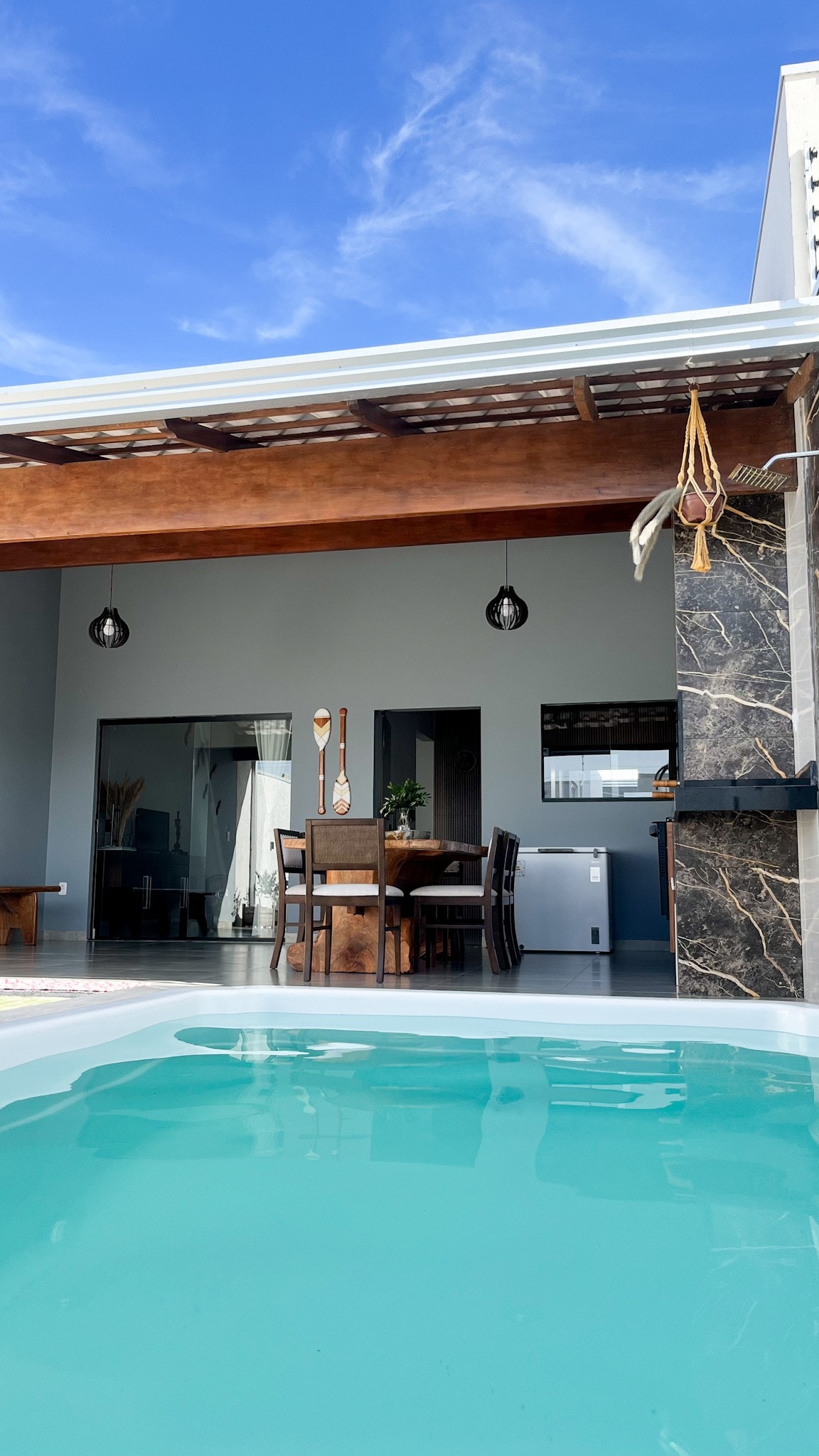 Casa com três suítes todas com ar condicionado, piscina, lavabo e chuveiro externo na área da piscina, mesa de jantar de madeira, sofá, TV c/ fire stick, cozinha completa com churrasqueira. Wi-Fi. Garagem para até 4 carros Desconto de 10% para 5 noites, 15% para 6 noites e 25% para 7 noites (automático). Mediante consulta de datas disponíveis Consumo de energia será cobrado a parte no final da hospedagem de acordo com o consumo (numero de kWh utilizados x 1,00 real)
