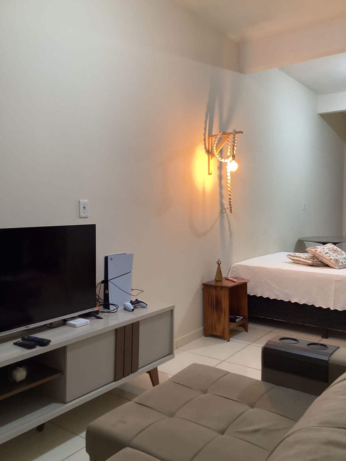 Apartamento novinho com 2 quartos com ar condicionado, garagem exclusiva, 1 banheiro, varanda gourmet com vista para o mar. Localização privilegiada em área verde dentro da cidade. Faça seu churrasco sentindo a brisa do mar. Observação: caso o hóspede queira usar, o imóvel possui um quarto pequeno com cama de solteiro e ventilador de pé.