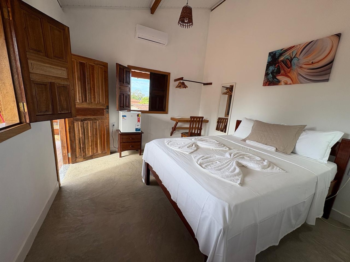 Suíte com varanda com vista para o mar. Possui ar condicionado e frigobar. Não possui cozinha. Até 2 hóspedes, cama tamanho casal padrão. A acomodação não tem espaço para hóspedes adicionais, ainda que crianças. O acesso é por escada, portanto, não recomendamos a hóspedes com mobilidade reduzida. A vista compensa o esforço. Localizado em condomínio de 4 casas no total. Piscinas, churrasqueira e estacionamento estão na área comum e são compartilhados com outros hóspedes, caso hajam.