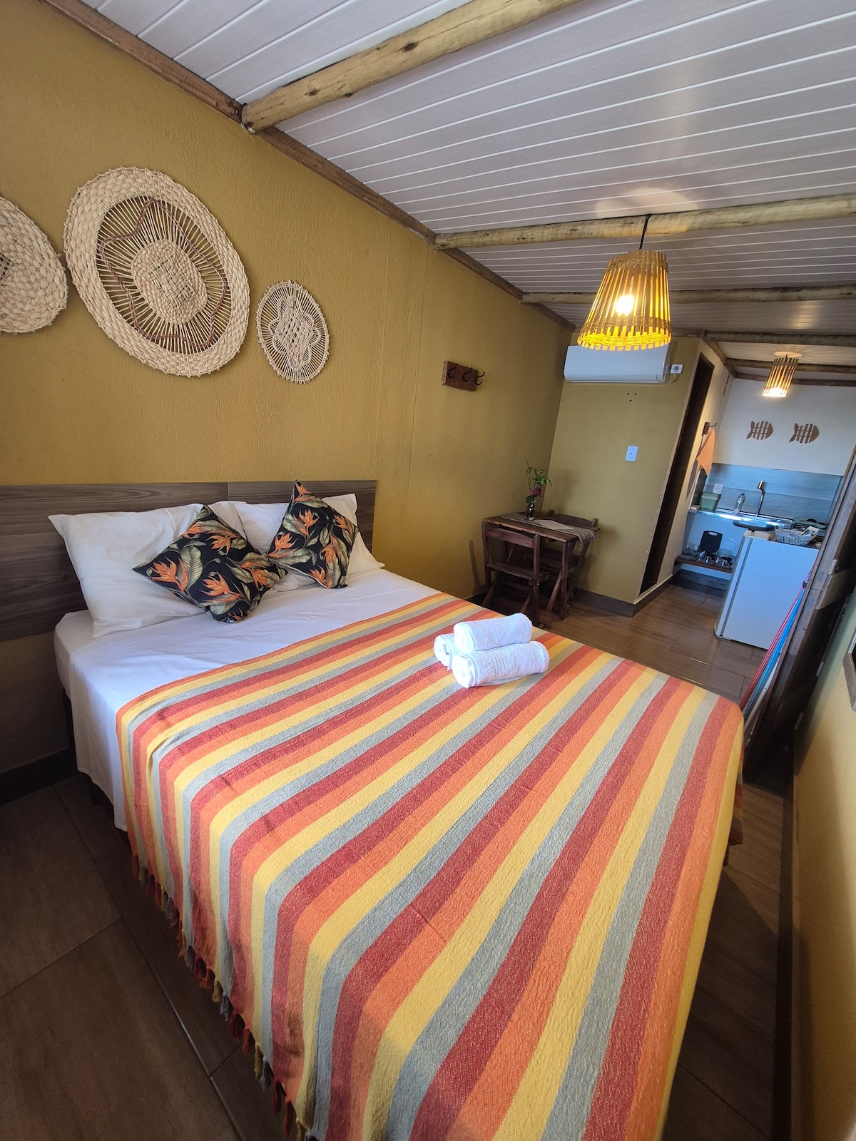 Um refúgio pensado para quem gosta de tranquilidade e natureza. O nosso Chalé possui 24m² e uma varanda privativa com vista para a mata. Na área interna temos 1 cama King, mezanino com 2 colchões de solteiro, banheiro com chuveiro elétrico e lavabo independente. A Cozinha fica na área externa com vista para a mata. Cada chalé possui sua área externa e um espaço com redes para descansar. Ficamos a apenas aproximadamente 2km do acesso mais próximo para a linda praia e a 8km da Ponta de Corumbau.