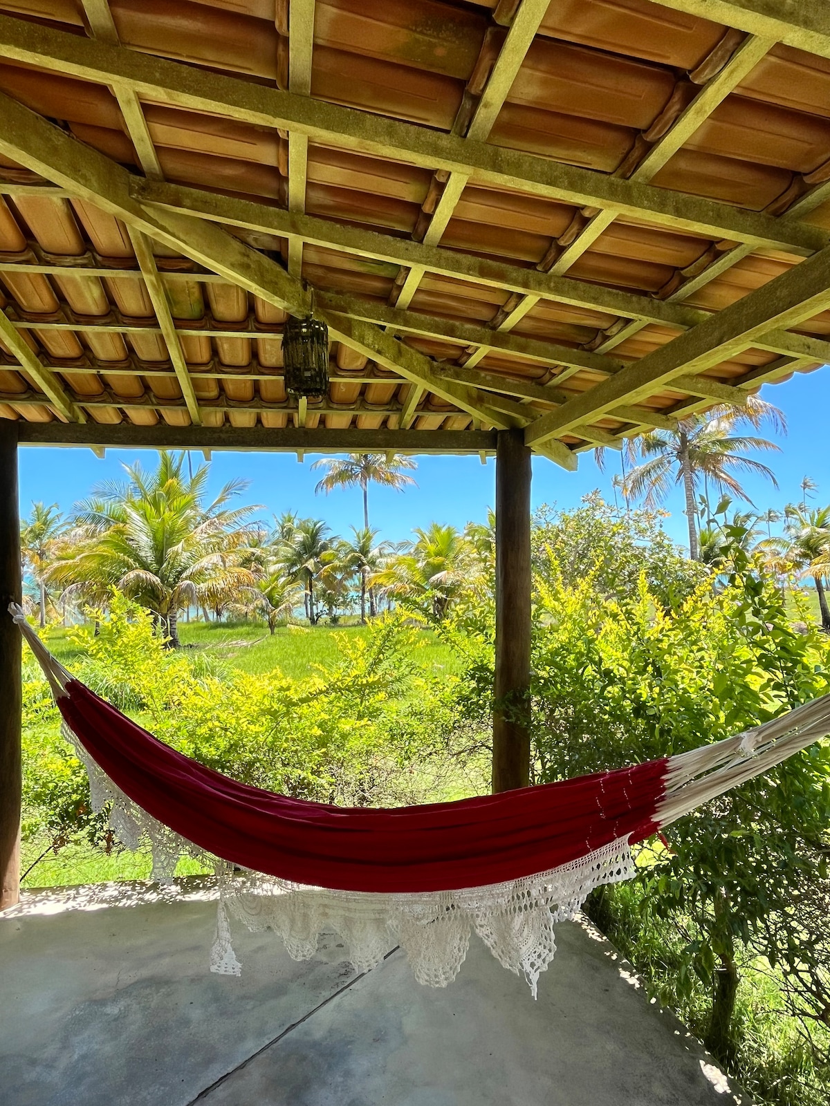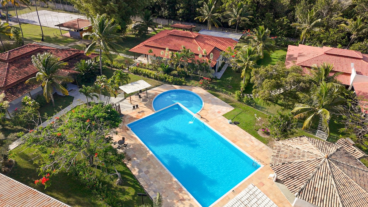 Casa Q Coisa is situated on top of a hill overlooking the village of Cumuruxatiba with panoramic ocean views.(See aerial photo). The area is 5000 sq m walled with mature mango trees. The pool is 16 by 6 m with a jacuzzi.There is a games space and a pool side bar. There are two chalets as well as the main house.The main house has 3 en-suite large rooms. The upstairs main room has a private verandah with ocean views.The grounds are lawned.