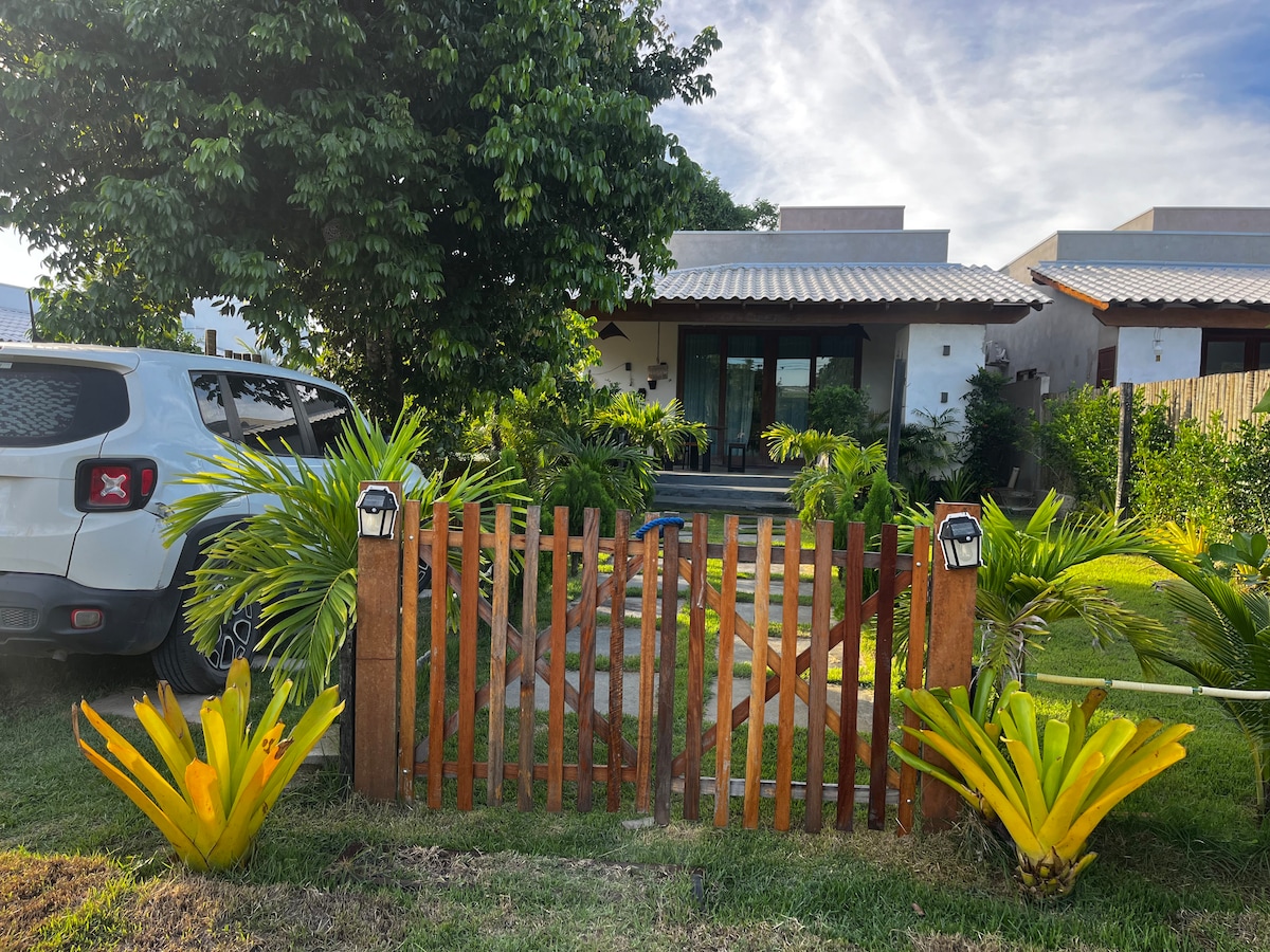 Casa ampla e confortável, próxima a praia, para curtir e descansar com sua família e amigos.Tendo 02quartos sendo um com suíte, todos com ar condicionado, 01 banheiro social,sala e cozinha conjugada é uma pequena área de serviço. A piscina e a área gourmet com churrasqueira é compartilhada. Condomínio fechado e segurança 24h. Temos mais 02 casas iguais a nossa no terreno.