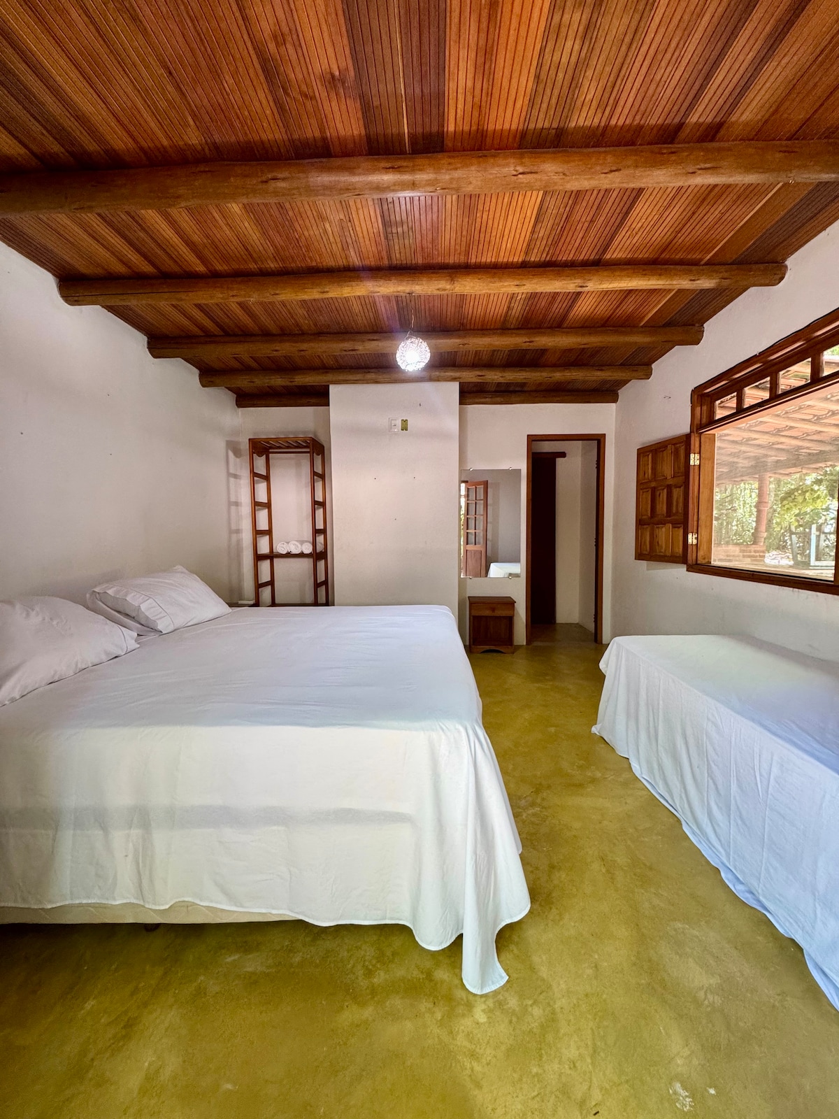 Se busca sossego e contato com a natureza, encontrou o lugar ideal! Nossa suíte confortável, cercada por árvores, oferece redes e jacuzzi ao ar livre, perfeito para relaxar com privacidade e clima baiano. Localizada em bairro tranquilo, a apenas 250m de uma praia deserta por trilha linda, 500m do centrinho com comércio e restaurantes, e a 5 km da charmosa Ponta de Corumbau. E o nosso café da manhã é delicioso para começar bem o dia!