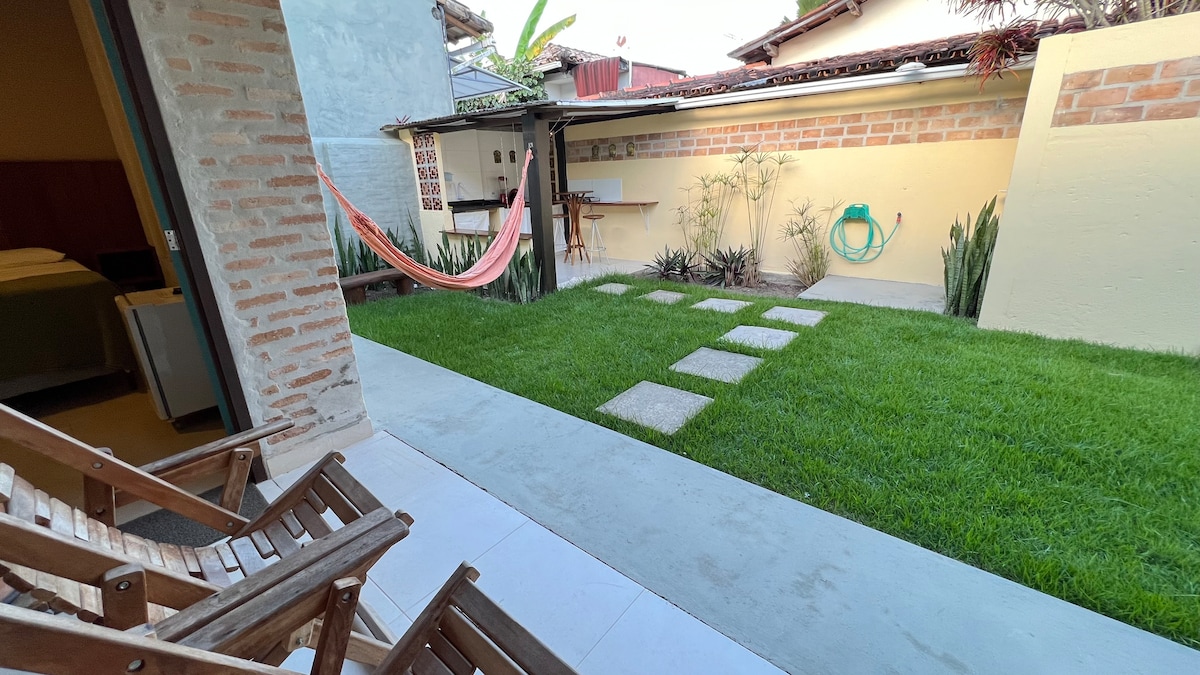 Se hospedar na Bahia numa suíte completa banheiro privativo, com cama box Queem, ar condicionado Split, estação de trabalho HomeOffice, frigobar, 2 redes de Internet alta velocidade, TV 55 polegadas smart, varanda com rede e a exatos 40 passos da praia, é sem dúvidas uma escolha para ficar guardada na memória. Não falta água pois tenho um poço Particular automático. cozinha completa externa, todos utensílios que desejar, desde maquina de gelo, taças, todos os eletros de alto padrão.