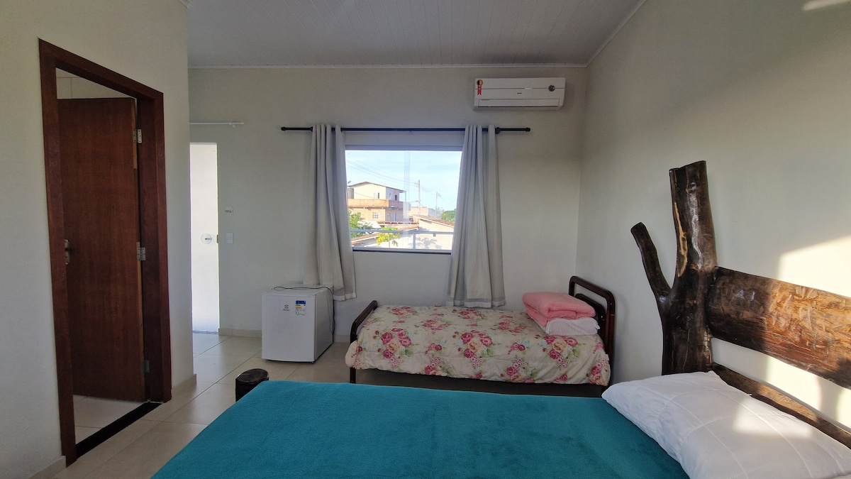 Suíte confortável e muito espaçosa (1 cama de casal e 1 de solteiro). 5 minutos a pé da praia e dos melhores restaurantes de Cumuruxatiba. Construção nova, quarto claro e arejado. Wifi e ar condicionado. TV na suíte. Frigobar na suíte. Suíte super limpa. Oferecemos roupas de cama e toalhas limpas e cheirosas. Ambiente tranquilo e familiar. Estacinamento fechado, com portão eletrônico. Área comum com vista para o mar e redes na varanda.