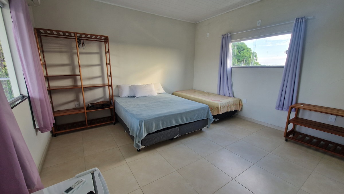 Suíte confortável e muito espaçosa (1 cama queen e 1 de solteiro). 5 minutos a pé da praia e dos melhores restaurantes de Cumuruxatiba. Construção nova, quarto claro e arejado. Wifi e ar condicionado. Frigobar na suíte. Suíte super limpa. Oferecemos roupas de cama e toalhas limpas e cheirosas. Ambiente tranquilo e familiar. Estacinamento fechado, com portão eletrônico. Área comum com vista para o mar e redes na varanda.