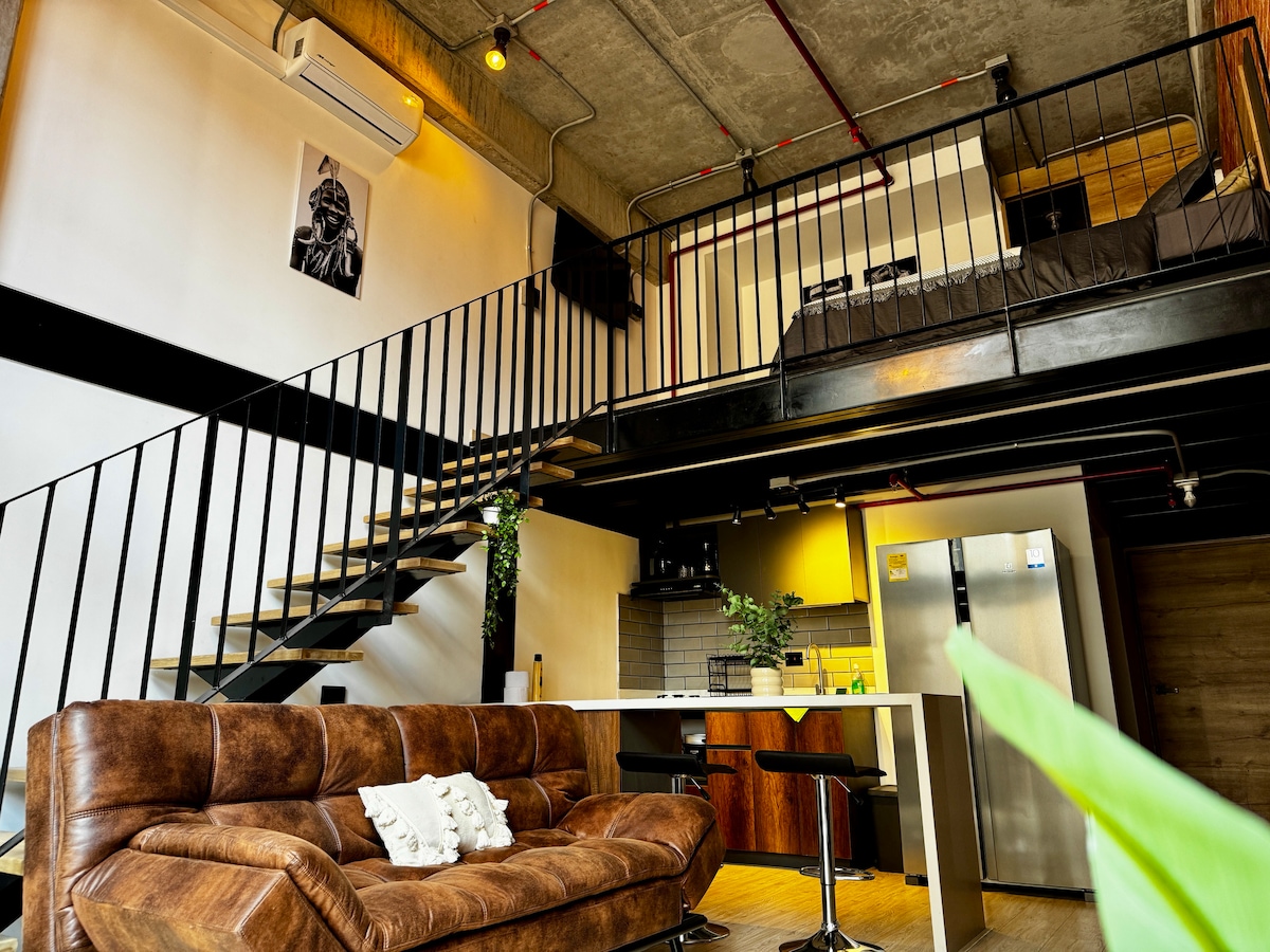 Modern 2-level industrial loft on the top floor of a new building in downtown Medellin. Features 1 bedroom, 2 bathrooms, full kitchen, living room, and dining bar. Building includes rooftop with jacuzzi, outdoor kitchen, gym, and 24h security. Located in La Candelaria, 1 block from the tram and near the metro. Just 15 min from El Poblado.