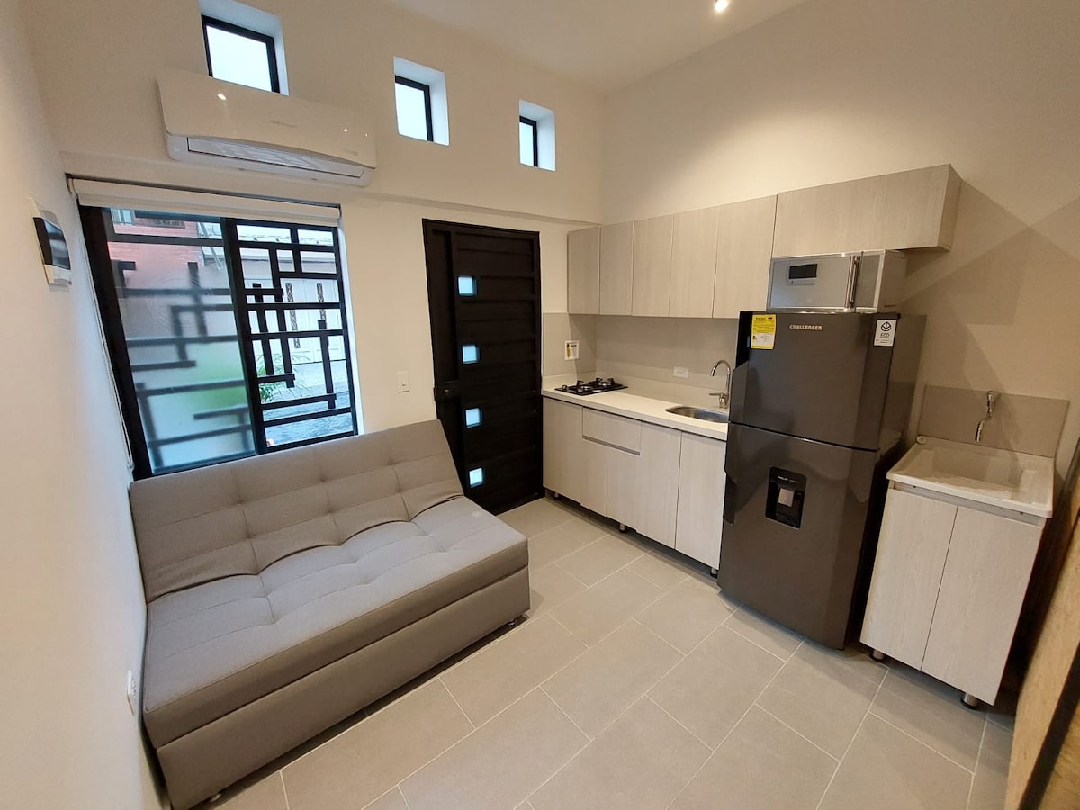 Disfruta Apartaestudio, cerca al centro comercial San Diego y el centro, estación bicentenario, casa de la memoria, sector muy seguro, es iluminado naturalmente, confortable, acabados modernos, aire acondicionado, wiffi 350 mg, agua caliente en baño, zona de ropas, zona se trabajo, cama doble, sofacama, secador de pelo, se admite mascota, No cuenta con parqueadero, la sencillez de este alojamiento es tranquilo y céntrico.