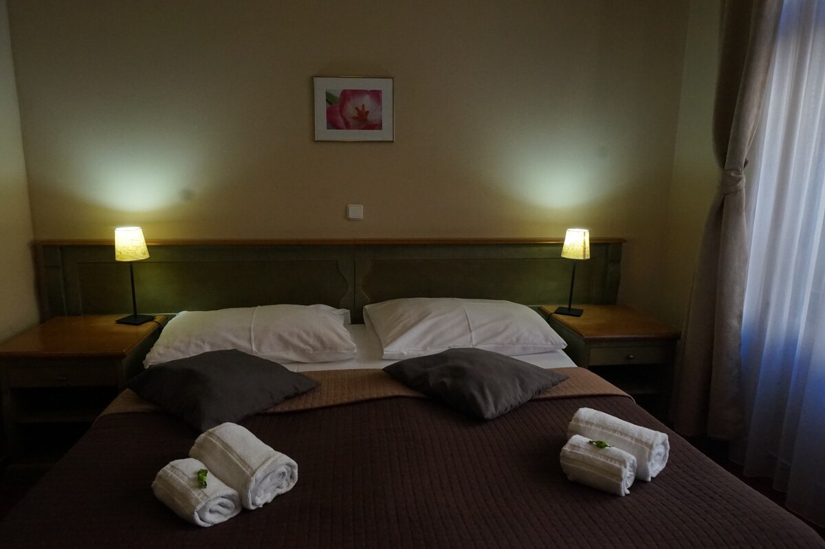 Double a barrierfree room on the ground floor, with barrier free acceess, furnished in classic style, yet providing modern comfort. There are two separate or joined beds. Room has private bathroom with disability access, equipped with shower enclosure suited for the needs of people with limited mobility, basic toiletries and hairdryer. In room, there is also a TV, safety deposit box, telephone. Room windows are facing quiet garden.