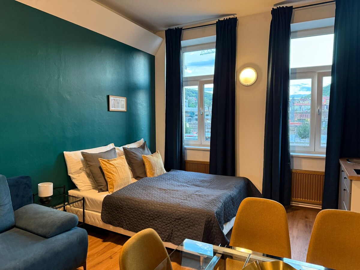 A beautiful modern airconditioned studio apartment in a renovated house in the hip Karlín neighbourhood in the centre of Prague, just at the underground station. The apartment is with high ceilings, full of light from two beautiful balcony doors, which give the flat unique atmosphere. From beautiful art to high quality memory foam mattress - everything is available for your perfect stay. Not a cheap Airbnb flat, but a designed home: fully equipped and full of quality materials.