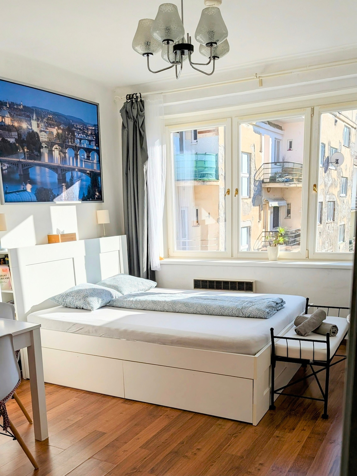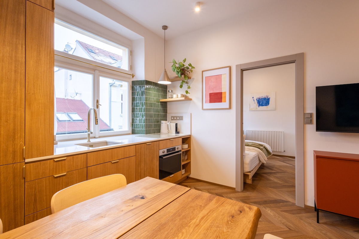 Spacious and light place with unigue views in old residatial neighborhood. Luxuriously furnished apartment offers comfort at every moment of your stay. Fully equipped kitchen, bathroom with shower and bathtub with a breathtaking view, TV with Netflix, quiet bedroom with a comfortable bed. Cafes, bakeries and bistros, pubs with the best Czech beer and cuisine, a local market right next door. Direct public transport to the airport, train station, Prague Castle, Old Town Astronomical Clock.