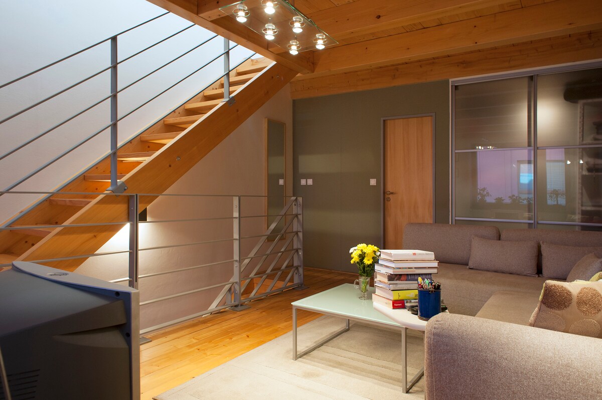 Snuggle up for a romantic night under a vaulted ceiling. This loft has been tastefully decorated with statement wallpaper in the bedroom area and boasts striking furniture that has been carefully selected to highlight the space. The bedroom is accessible by stairs. It has comfortable King size bed with quality mattress, chair and wardrobe. The living room is combined with kitchen and has large dining table. We will do our utmost for you to be delighted!