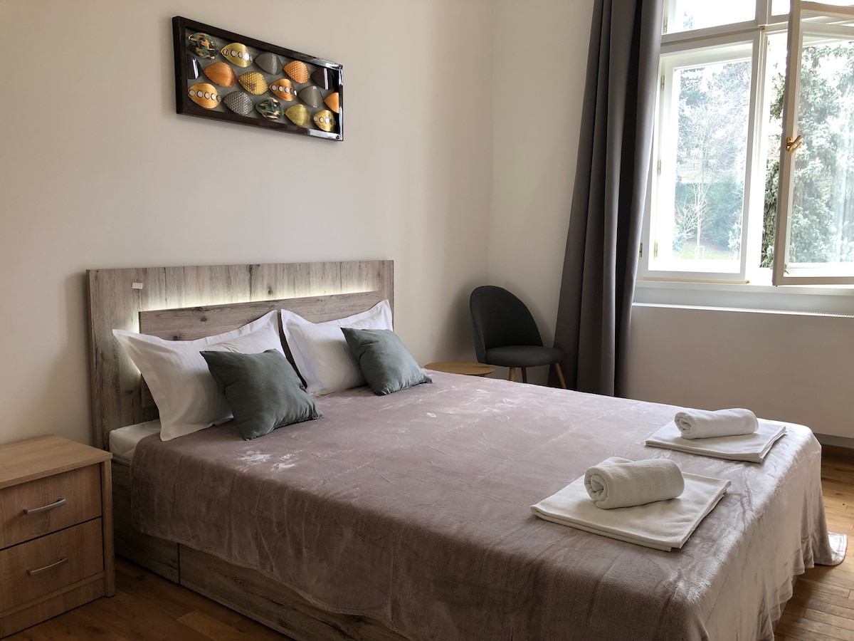 Newly renovated completely furnished apartment (50m2) in the heart of Prague on a quiet, gardens and villas-lined street. It features 2 rooms, living room with a sofa bed and a fully equipped kitchen. And a bedroom with a wooden bed and comfy mattress. A luxury bathroom with built-in speakers. The apartment is 10 mins from the old tawn by tram (3km). The station just steps away. Parking place on the street infront of the apartment (8EUR/day) or 1,5 km (8EUR/5 days - let me know to manage it).