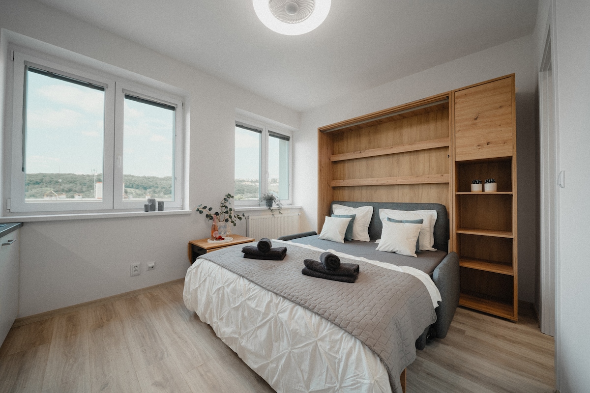 Discover the charm of modern living in our designer studio at the Hagibor complex! Enjoy the comfort of home with a fully equipped kitchen, Nespresso coffee maker, and relaxing book or Netflix evenings. With a balcony, garage parking, and fast internet, it's an oasis of calm in the bustling city. Just a short walk from Želivského metro station on the green line, you're moments away from the historic city center. The perfect place for your urban adventure!:-)