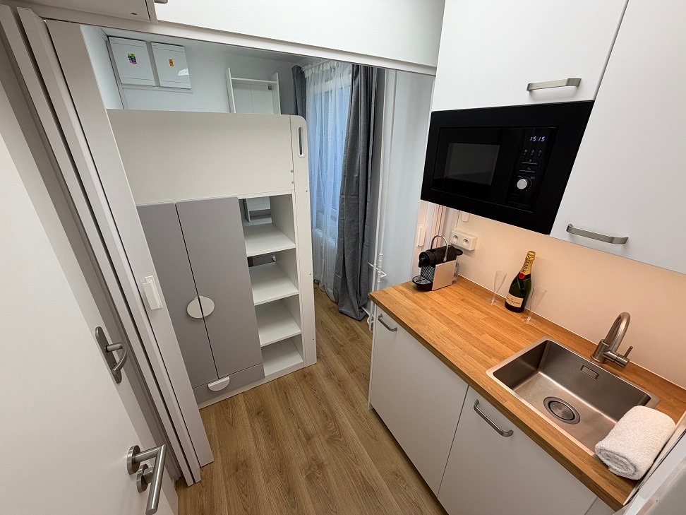 Stylish studio in a quiet part of Prague. Open space with double bed, cozy lounge with TV, and kitchenette with coffee maker. Elegant bathroom with gold details, shower, and toiletries. Wi-Fi, bar seating with view. Tram stop at the door, metro a few minutes away. Free parking available on request — just a 3 minute walk from Greenpoint. Please note that the exact parking dates always need to be confirmed in advance.