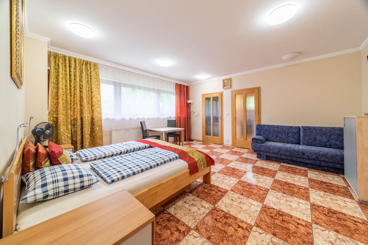 The flat is equipped with a shower, a kitchenette, a double bed and an extra bed (there is a folding couch for 1, max 2 people). There is WIFI. A desk, chairs, a coffee table, a fridge, a kettle, dishes and cookware, a hairdryer, blankets, towels, a Prague guide in english language, a map of Prague, a shampoo, a soap and a toothpaste, also basic food (coffee, tea, sugar, ...) - those all are another pieces of the equipment. Toilet is situated next to the flat, but it belongs only to the flat.