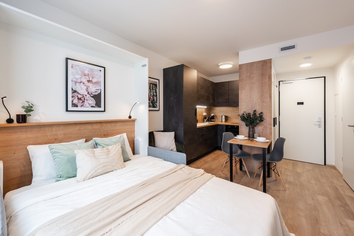 Very cozy modern nicely decorated apartment with a brand new kitchen, bathroom and two full-sized beds, ideal for a family of four or two couples. Excellent location - it is located in a calm neighborhood near Andel station, where you can take the metro/tram and get straight to the center in 10 minutes or get anywhere else pretty easily . There is a shopping center, many restaurants and a park within walking distance.