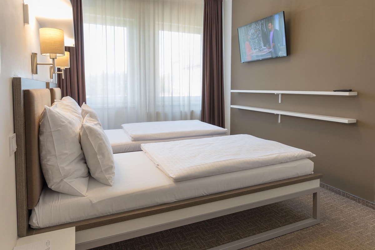 A lovely hotel room with a bathroom and a view of a quiet courtyard. Working desk. Free Wi-Fi. TV. The renovation took place in 2024. Quiet neighborhood within walking distance of historical monuments (800 meters Wenceslas Square). Shops, cafes, cinemas, parks nearby. Please note that city tax 2,2€/pers./night is to be paid upon arrival.