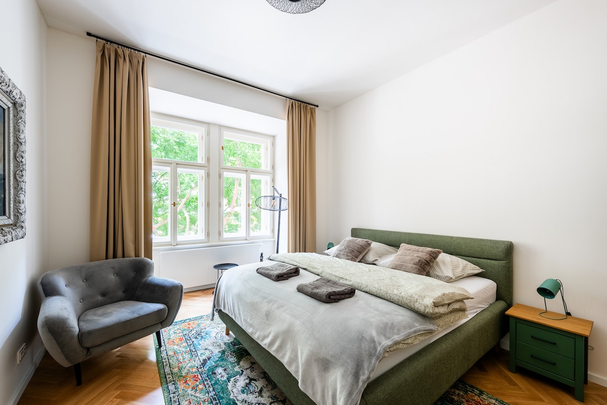 Wake up to a rare view of Prague’s historic Old Jewish Cemetery right from your living room. Located in the heart of Old Town, just steps from Charles Bridge and Old Town Square, you can explore the city on foot. The bedroom faces a quiet street, ensuring a peaceful night’s sleep in the center.