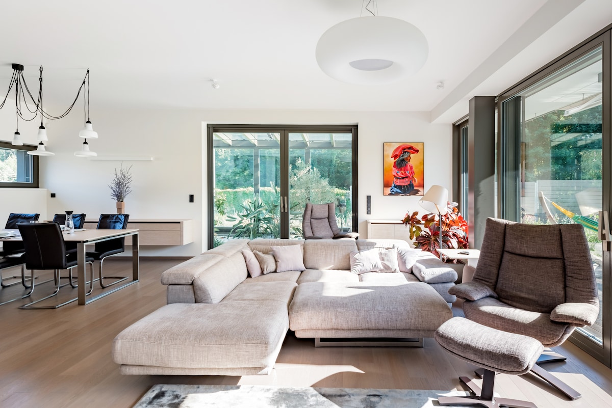 房间靠近市中心,位于建筑师设计的别墅内,带游泳湖