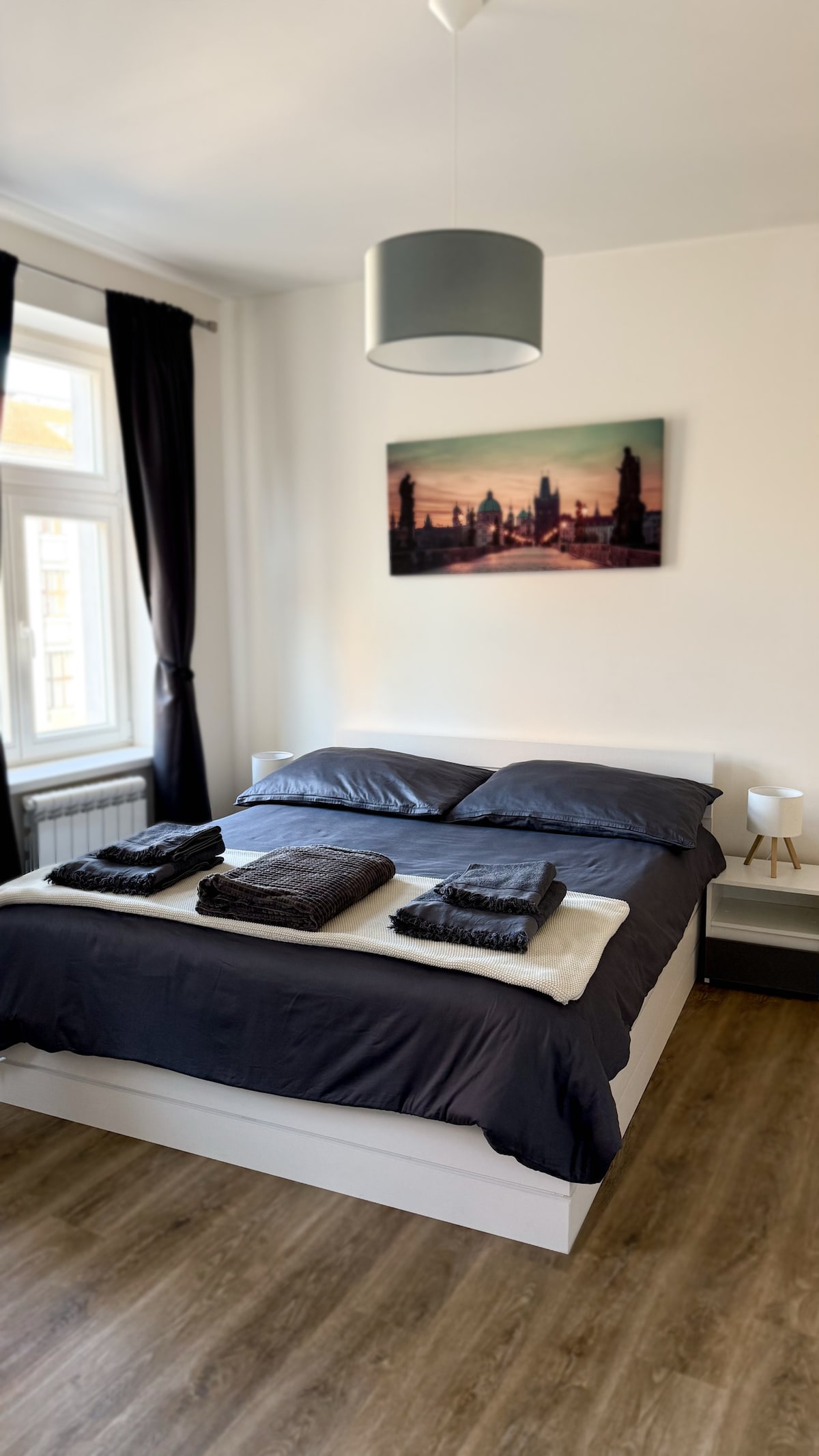 Spacious and light place with unigue views in old residatial neighborhood. Luxuriously furnished apartment offers comfort at every moment of your stay. Fully equipped kitchen, bathroom with shower and bathtub with a breathtaking view, TV with Netflix, quiet bedroom with a comfortable bed. Cafes, bakeries and bistros, pubs with the best Czech beer and cuisine, a local market right next door. Direct public transport to the airport, train station, Prague Castle, Old Town Astronomical Clock.