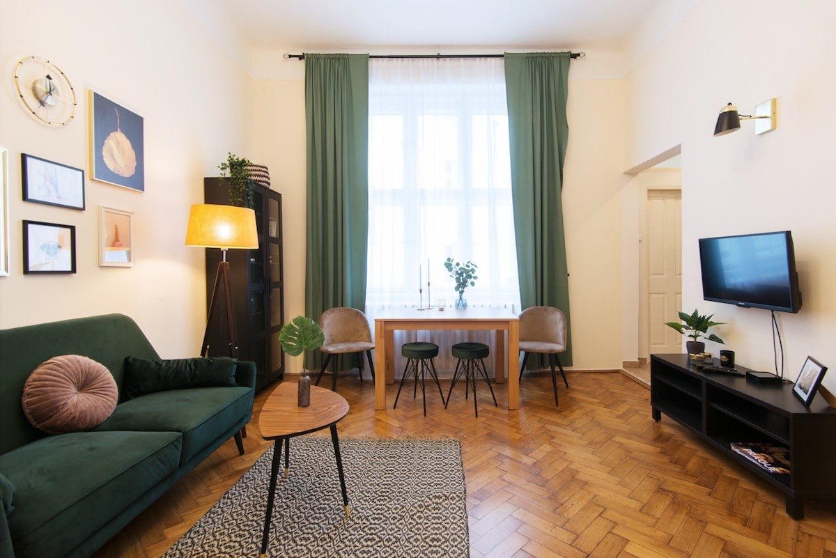 We'd love to welcome you to this Classy apartment at Malatova street, in the historical heart of residential Prague. Steps to the riverside, 10 min walk to Kampa, 15 min walk to Charles Bridge and the very center. This home with unique style is best suited for business travelers, couples, and families on a mid-term stay. Set in a historical building (without an elevator), the apartment has generously divided space into hallway, separated WC, bathroom with hot tub and spacious rooms. Welcome!