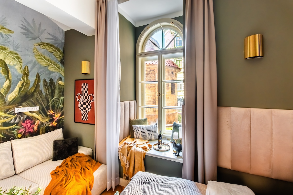 Wake up to a rare view of Prague’s historic Old Jewish Cemetery right from your living room. Located in the heart of Old Town, just steps from Charles Bridge and Old Town Square, you can explore the city on foot. The bedroom faces a quiet street, ensuring a peaceful night’s sleep in the center.