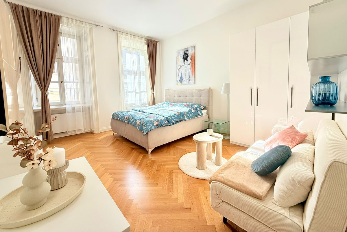 Just a 3-minute walk from iconic Charles Bridge, this elegant 30m² apartment sits on a quiet street in the heart of Prague’s Old Town. Located on the second floor of a beautifully preserved 17th-century Baroque palace, it’s filled with natural light and historic charm. Renovated to the highest standard, the apartment features designer furnishings, air-conditioning, and a spa-style bathroom with rain shower and heated floors. All major attractions are just steps away—an ideal base for your stay.