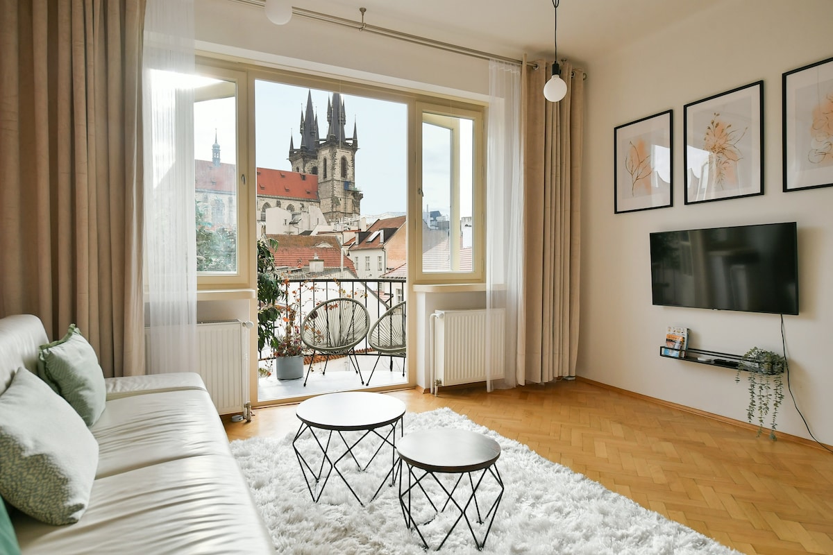 Cathedral view from bed – especially at night. Quiet apt with courtyard orientation in heart historic centre features acoustic glazing for a restful night, private balcony for morning coffee and evening relax. Shared terrace with panoramic views . High-speed Wi-Fi for work. Steps from Old Town Square, Charles Bridge, the Jewish Quarter and Pařížská with the city’s best cafés, restaurants, bars and boutiques. Ideal for couples, honeymooners, the discoverers vibrant nightlife, business stay.