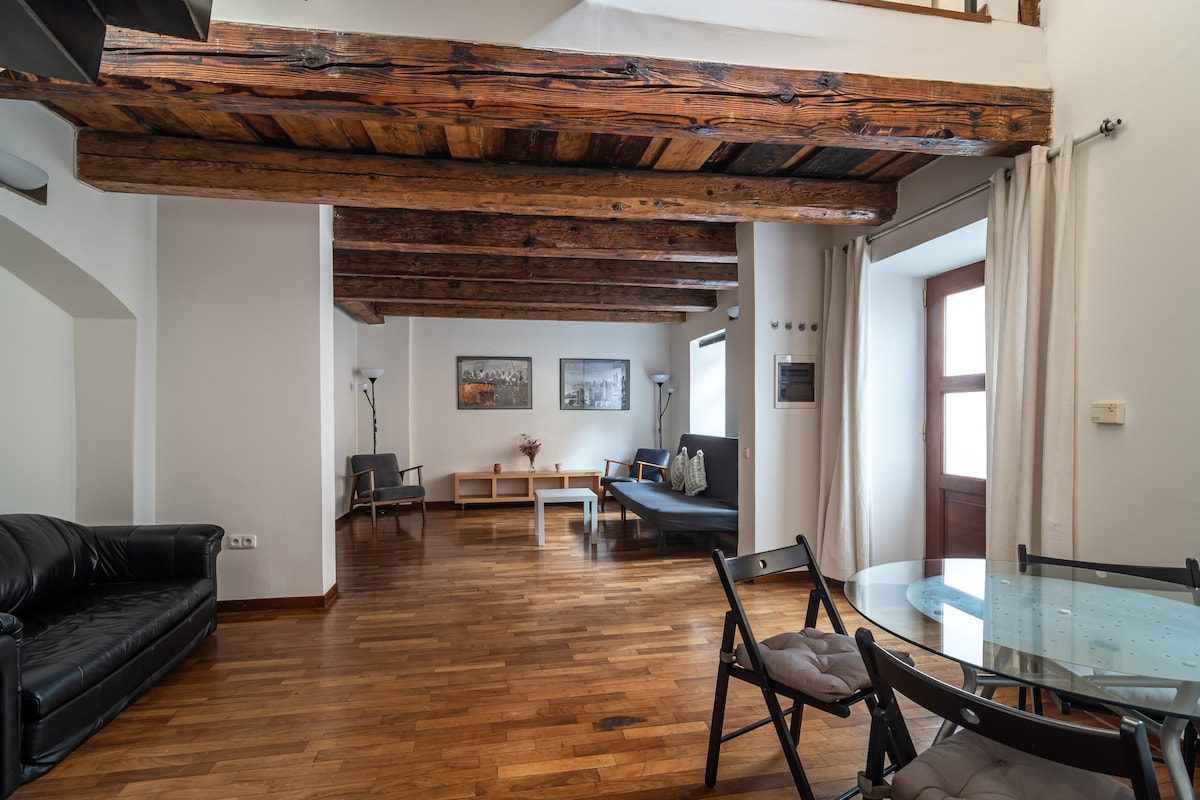 This centrally located loft is very spacious (130sq meters) and the windows bath each room in light, however, blinds in the living room and black out blinds are on the windows in the bedroom to ensure a proper rest. Please note that the common premises are being renovated with the scheduled end of works by mid October 2024. There is no noise associated with the works.