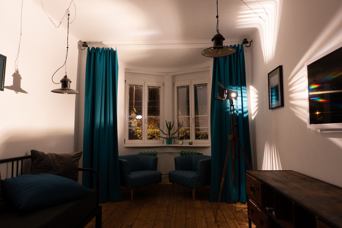 Comfortable flat with unique industrial/ retro flair. For up to 4 guests, 2 separte bedrooms, 2 LED TVs with GER/FR/ENG/ESP channels, internet. Equipped kitchen, incl. dishwasher. Relax area with leather lounge suite. --- Perfect connection: subway 300m (only 3 stations to the main railway station), tram in front of the house (10min. to the centre, goes very often), by walking 20min. --- Shops, restaurants&bars, ATM directly on the spot. --- Guarded parking possible (extra fee)