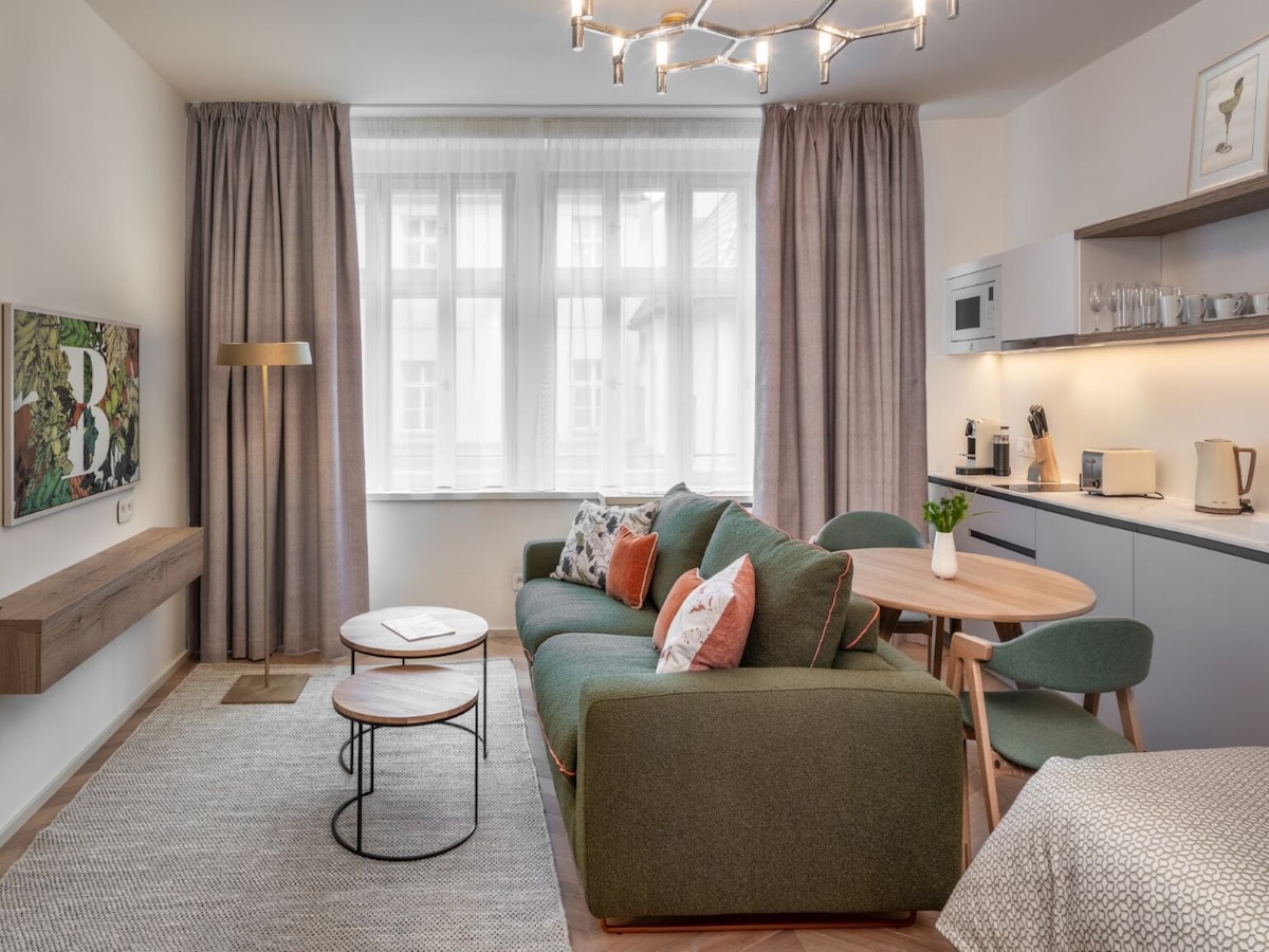 Cathedral view from bed – especially at night. Quiet apt with courtyard orientation in heart historic centre features acoustic glazing for a restful night, private balcony for morning coffee and evening relax. Shared terrace with panoramic views . High-speed Wi-Fi for work. Steps from Old Town Square, Charles Bridge, the Jewish Quarter and Pařížská with the city’s best cafés, restaurants, bars and boutiques. Ideal for couples, honeymooners, the discoverers vibrant nightlife, business stay.