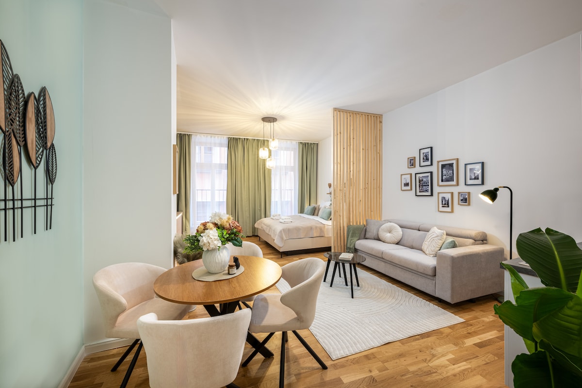 Welcome to our luxurious stylish apartment in the heart of Old Town, offering breathtaking views from every window. Immerse yourself in the city's rich history as you explore key attractions like the famous Orloj clock and the Charles Bridge, both just steps away. Indulge in the best of both historic and modern spheres with high-end shopping streets with delicious coffee shops, restaurants and the vibrant club district within easy reach, ensuring a perfect balance of convenience and excitement.