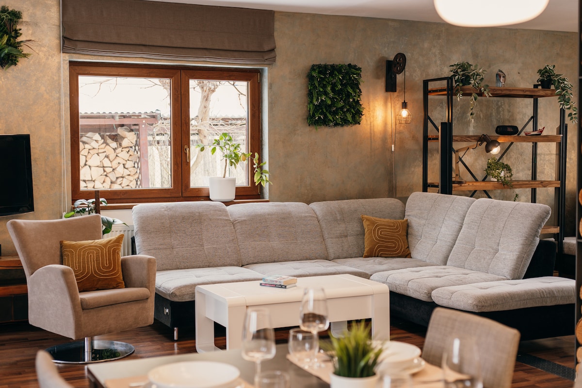 🍀Relaxujte v moderním klimatizovaném domku s terasou s relaxačním nábytkem, luxusní vířivce ( 60 min denně ZDARMA) nebo v bazénu ( jen léto), houpací síti, u ohniště, pod bioklimatickou pergolou s jídelním nábytkem, při grilování v krásné zahradě 1600 m², děti potěší velké dětské hřiště. 🫶 Bazén i zahradu sdílíte s naší rodinou- náš dům i Airbnb domek jsou vedle sebe ❤️ Pro páry, rodiny i psí miláčky Centrum Prahy – 20 min Aquapalace Čestlice – 10 min Westfield Chodov – 20 min Zoo – 35 min