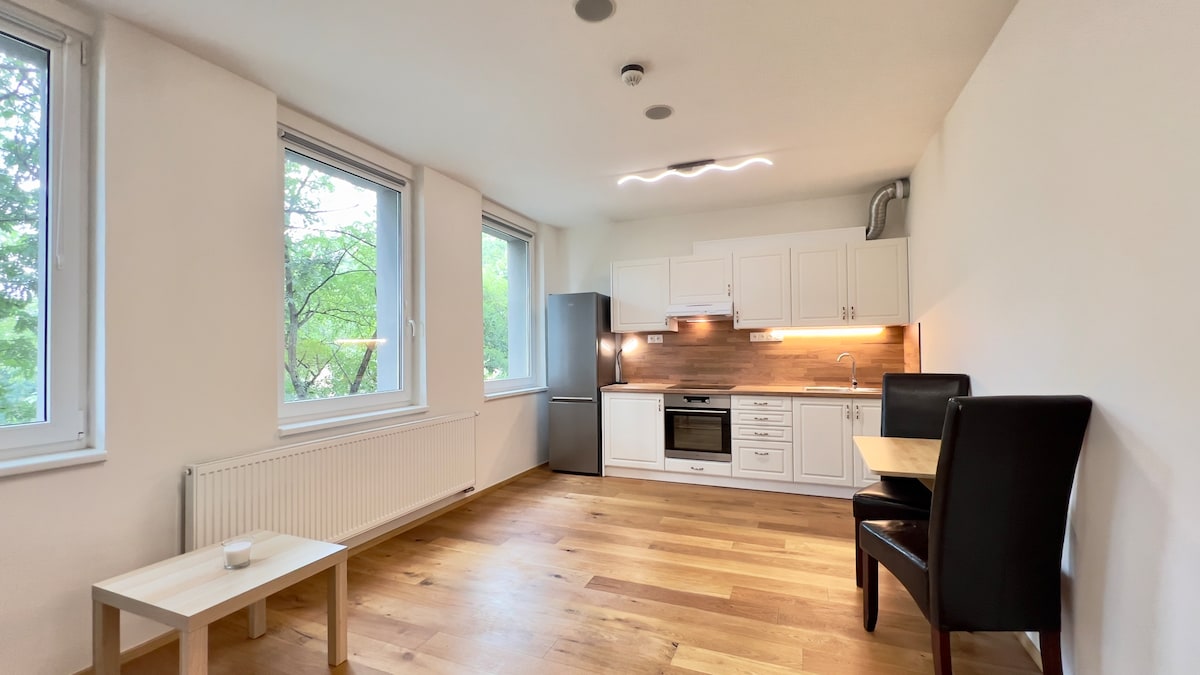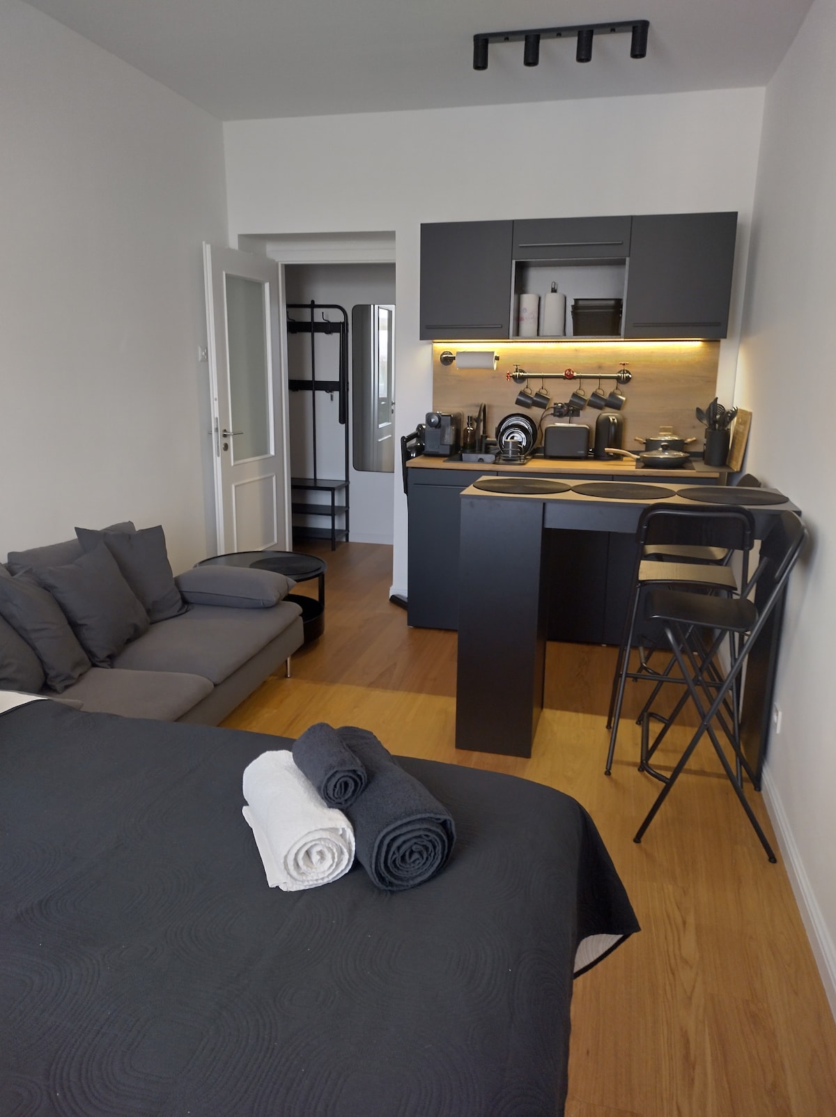 This stylish place to stay is perfect for group trips. Relax and unwind in our elegant design studio in Vinohrady. This cozy space includes a double bed, a kitchenette, and a modern bathroom. Enjoy Prague from the best spot and experience the lively local scene with cafes, shops, and excellent transport links. This apartment belongs to a group of units within the same category. While all units offer the same amenities, there may be subtle differences in color schemes and design elements.