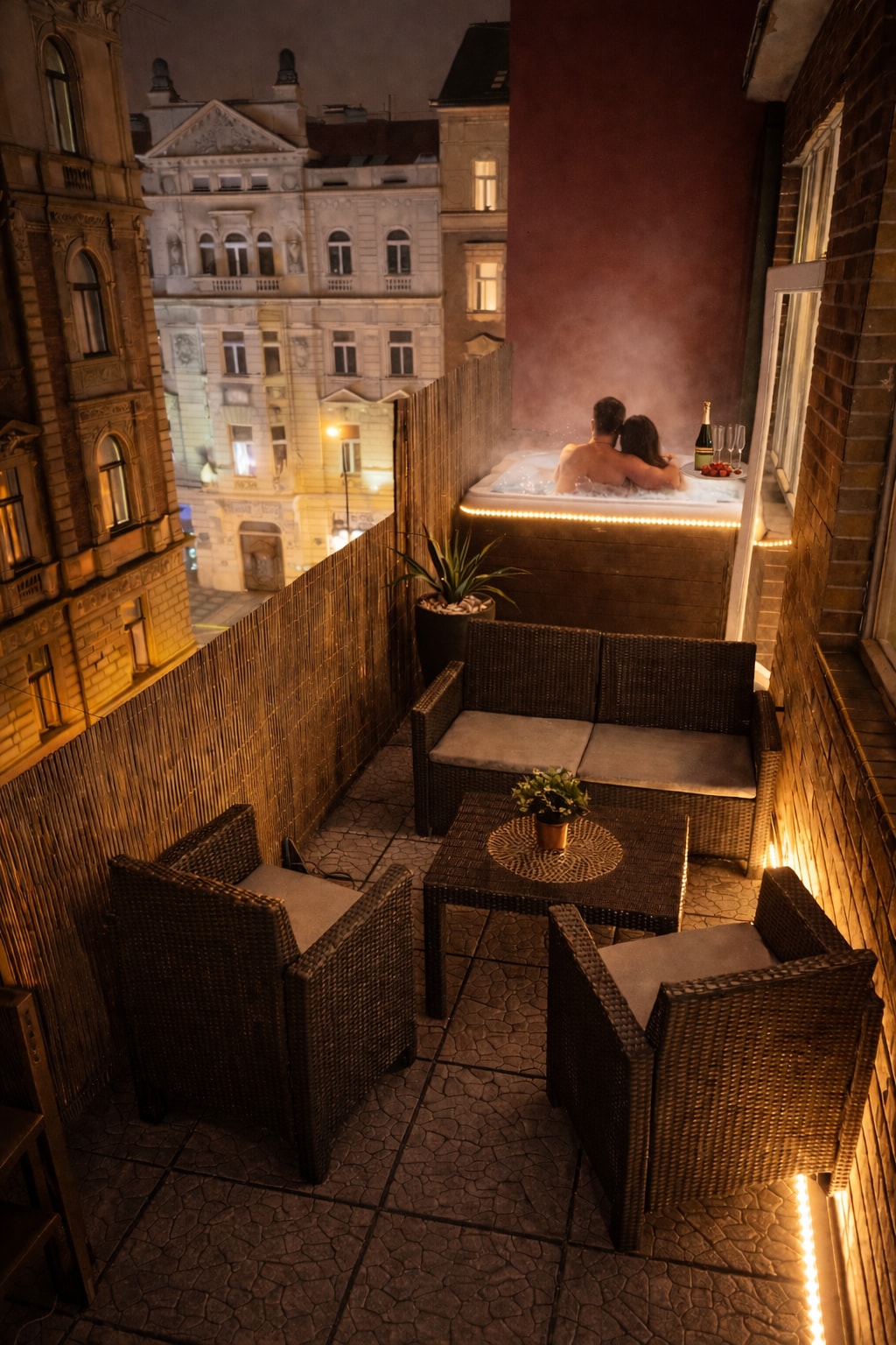 Nový moderní apartment, nacházející se v klidné častí Prahy v bezprostřední blízkosti parku a zároveň vzdálený jen 15 minut od centra Prahy. Je vhodný pro 2 osoby vyhledávající ruch velkoměsta a zároveň si po namáhavém dni chtějí nerušeně užít příjemný večer s posezením na soukromé terase 30m2, pod pergolou ve vlastní vířivce s celoročně vyhřívanou vodou či relaxovat v prostorné privátní sauně. Ke zpříjemnění romantiky stačí jen zapnout elektrický krb. Parkování zdarma. ve společné garáži.